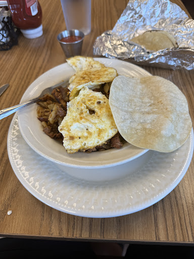 The food was just off the mark. If there were a few tweeks, the food could be excellent. The wife ordered a Pastor Omelette and I had corn beef hash. On both plates the home potatoes were very bland. They looked like cut up boiled potatoes that were thrown briefly on the flattop. No browning on the potatoes no seasoning and no taste. A little seasoning salt or onions would go a long way to improving this item. The Pastor Omelette was an egg omelette with the pastor placed into the fold, not mixed in. This wasn't a problem but the egg part was a tad over done and dry. Thus making the entire omelette crumbly. Either some sour cream or some other binder is needed. The corn beef hash has all the makings for a great meal but fell just short. Again slightly over cooked, there were very hard and dry strands. Taste was okay but a few onions or peppers would have given this dish some pop.