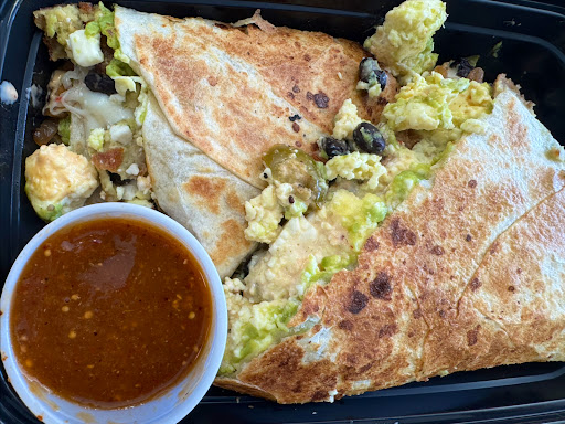 I am a vegetarian so she helped me optimize my quesadilla by subbing falafel instead of meat and adding veggies (50¢ each) like black beans, jalapeños, caramelized onions, and feta.