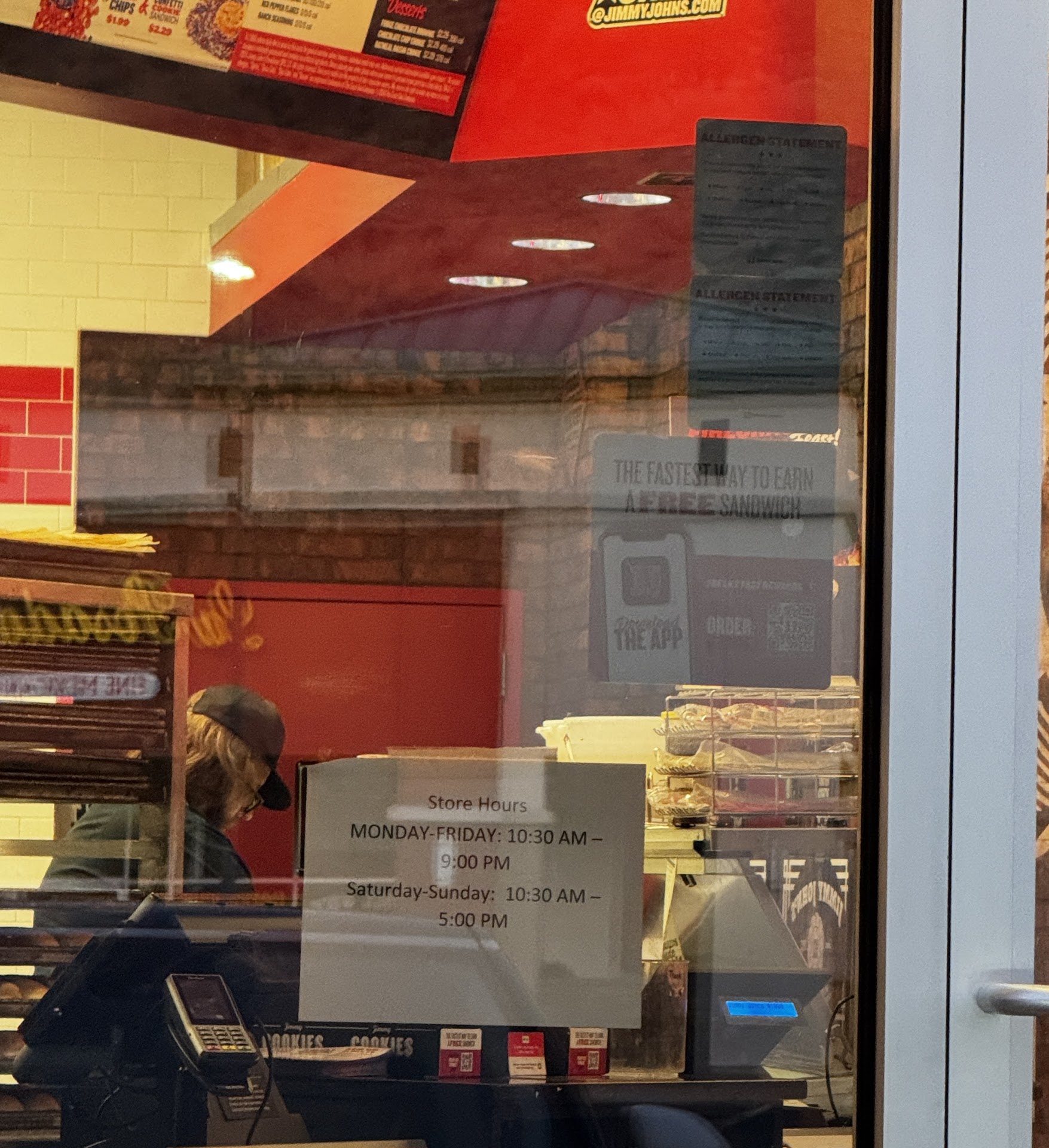 Ā Ā Ā Read moreTerrible experience. The guy with glasses and beard in the photo was very rude, unprofessional and basically didnāt want to work there. We came to the store at 8:30pm and the store hours said they close at 9pm as shown on the photo. I asked the guy whether they are open and he says āUnfortunatelyā and started saying something to the woman behind him and then started throwing stuff around. I was confused, and then asked again since he seemed annoyed to be open. Same answer. I told him how are you open if youāre throwing a tantrum and saying āunfortunatelyā. I almost lost it but just left the place. I didnāt want to take a risk with my food being prepared by some unstable tantrum throwing guy. We love eating at jimmy johns but weāll never step again into this location or maybe any location if the owners canāt even hire proper personnel (these people are preparing our food). The owner of this location should definitely consider firing this guy, heās costing them a...