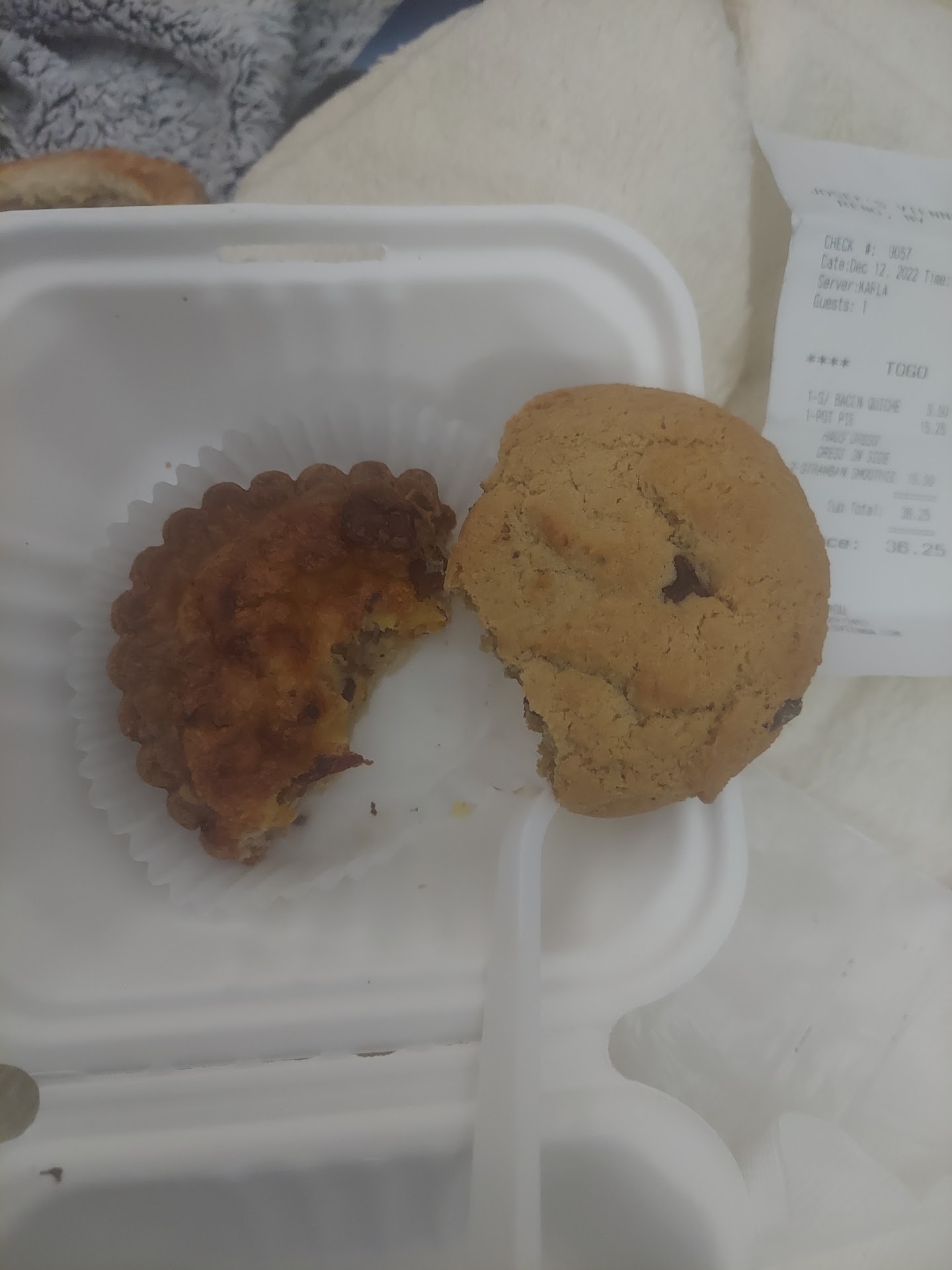 My lady and I stopped in because it was a place we hadn't been to before. It looks quaint and homey. My lady loves to get stuff at bakeries so we went in and the bakery food looks pretty good. I'm not much of a pastry person. I was hungry though. I took a quick glance at the menu and saw they have chicken pot pies. My girl decided on the bacon quiche. We also ordered 2 strawberry smoothies. The bill was $36 and change. It seemed like it was a bit pricey but it didn't bother me much. Then we got the food. The quiche was a joke, it was not only, obviously heated up in the microwave, it was dry and looked gross. The pot pie was $15 and it was half the size of one of those nasty Swanson pot pies and it tasted like tuna salad with frozen peas and carrots with some other vegetables that I couldn't identify. It was also dry and consisted of mostly pie crust. The salad it came with was pretty good though. The cookie that was supposed to compliment the meal was almost flavorless until I got a chocolate chip. The smoothies were tasty but not so tasty that I would ever have paid almost $8 for each one. There are way better and bigger smoothies for half the cost all over reno and you can get good food to go with the smoothies at other places. The 1st picture shows the cookie next to the quiche. The cookie isn't very big but it's bigger than the quiche. The 2nd picture shows the size of the pot pie and you can see how much crust there was on the pie. KFC has pot pies that put this place to shame. So does Safeway actually. Very disappointing. Wouldn't recommend it to anyone I like. Anyone that says the food is excellent and the pastries are even edible, is either a sheep or has no idea what good food tastes like. I would hate to have to be around when they ordered food that they didn't like.