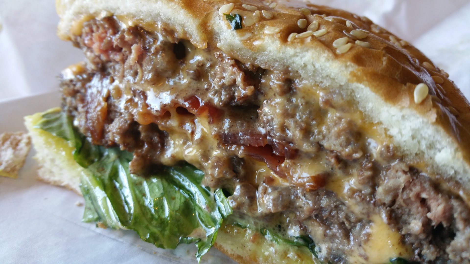 Now, they did put the lettuce on the bottom bun, which is correct. Normally, this helps prevent a soggy bottom, but it didn't go as well as they'd planned. Between the over-buttering, under-grilling, and the "juice", the bottom bun was so thoroughly soaked that it was as thin as a wafer under the weight of the burger.