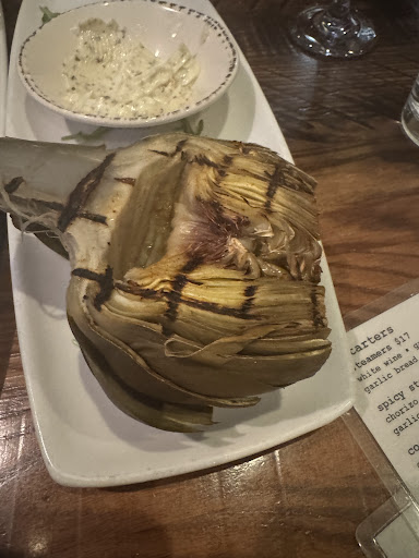 My wife got the: GRILLED FLANK STEAK $18 marinated flank steak / sautéed mushrooms / cabernet reduction gorgonzola butter / garlic mashed potatoes / seasonal vegetable The steak was cooked perfectly (medium rare) and was full of flavor. The seasonal vegetables were the part that made my wife nervous, thinking that these would not be fresh, but they were definitely fresh and seasoned and cook well. The mashed potatoes were light and fluffy with a not over powering taste of garlic. To be honest the gorgonzola butter was the piece that made the dish YUM!.