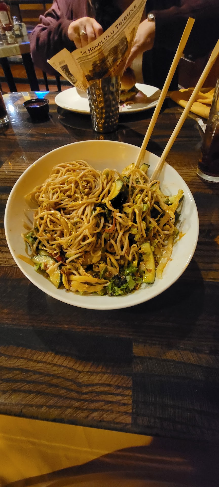 He ran into some patrons and the food went flying everywhere. Back to the kitchen to start all over. They did recover some of the other soups that did not spill, unfortunately it was only tepid and not hot as soup should be; probably sitting back there waiting for him to come get it.