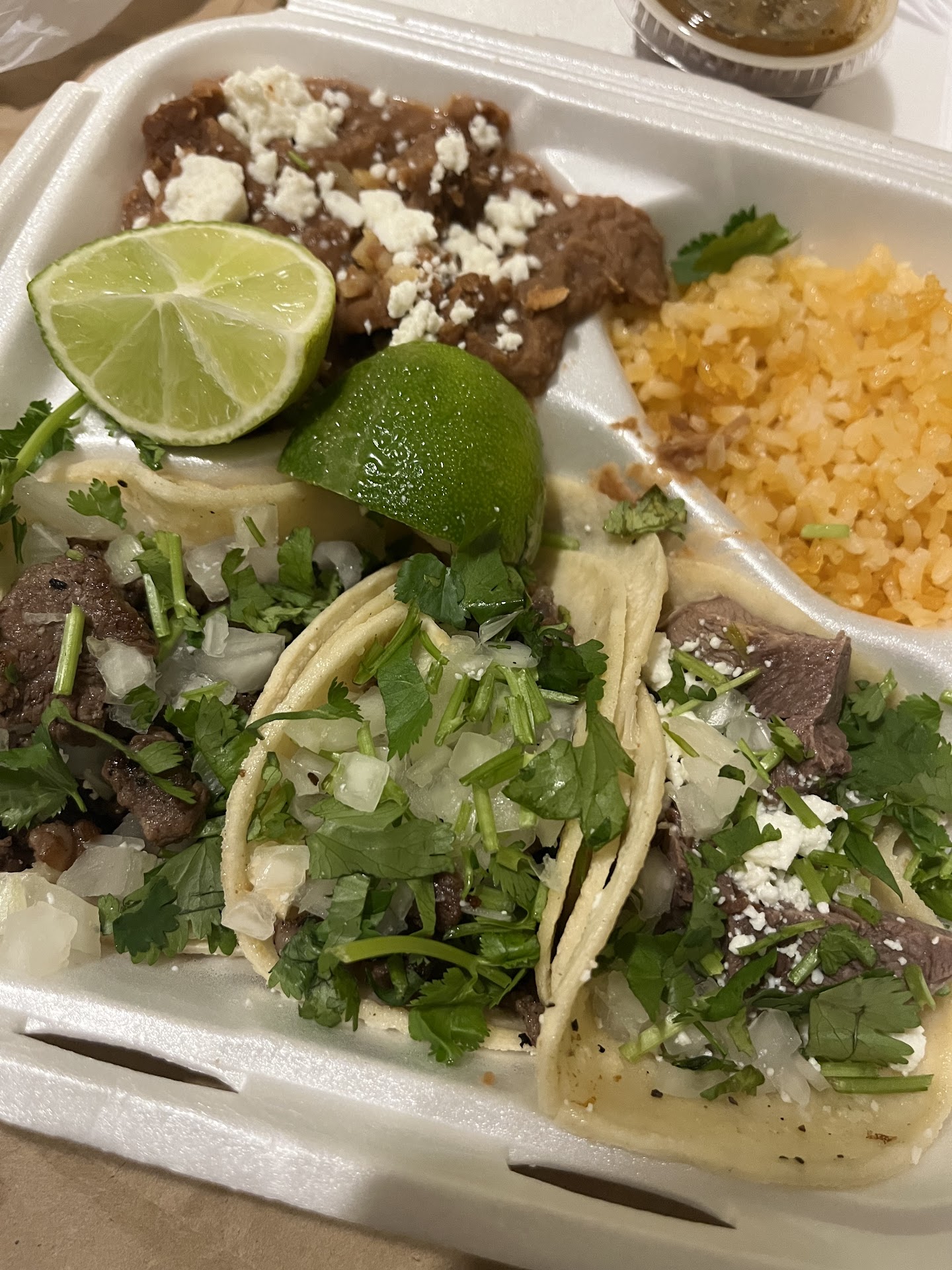 Read moreAfter reading the reviews on this place I decided to order dinner for take out. I ordered the number one: three taco dinner plate. Two carne asada tacos and one lengua. The lengua was SUPER tender. It was cooked to perfection. All three tacos were delicious. Beans were nice and soft and creamy. Rice had a few stiff pieces in it but I came in literally as they were closing so I’m sure it was the end of the night rice. They held the door open for me so I could pay for my dinner and take it home. Thank you so much! They also have fresh baked goods and gorgeous handmade cakes. There is masa and home made salsa available too. The two pastries I purchased were so flaky and tasty. Very fun for dessert. Staff were very kind and friendly. Will definitely be...