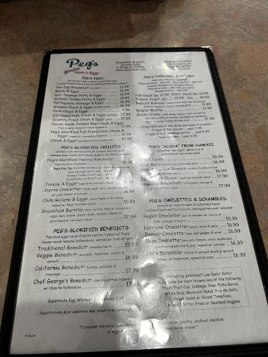 Husband & I had breakfast here about 7:45 AM Tues 4/30/24. We’ve eaten here many times over the years when in Reno from the Bay Area. Love it. This early morning there were only about 4? 5? booths occupied when the waitress (slender attractive short-haired blond) sat us at a nice front booth. We placed our order - mine traditional Eggs Benedict. Meals were first delivered to 2 customers next to us who arrived after us. Okay. Then our meals came and my Eggs Benedict looked great. Cut into the egg, and it was hard boiled. So I kindly called over the waitress, and she was as surprised as I was, and she took my plate to correct it. After a few minutes, she came back with my plate and the hollandaise was a darker color with kinda lumps in it and it filled my plate full like gravy, messy. I thanked the waitress and dived in. My first bite and the hollandaise had a cheesy taste, not hollandaise, and it was cold. Refrigerated COLD. I kindly called over the waitress and told her this, and I asked her to put her finger on the tip of the sauce and she felt it was cold. She said something about she’s worked at many restaurants, and sometimes hollandaise comes out cold. REALLY???!! She asked if I wanted to have it heated up and I said yes. She took my plate over to the microwave and put it in. She pressed the button and let it run its course, checked the plate and then put it back in the microwave and hit the button again. I told my husband that the egg will be overcooked. She brought my plate back and at this point my husband was about fini with his breakfast. He asked to taste my hollandaise and agreed that it did not taste like hollandaise - it was cheesy and thick with small lumps which indicates curdling. Was this leftover from the fridge and not continuously whisked as hollandaise should be prepared or reheated? This was fridge reheat? I ate one egg which did run as a poached egg should, and then I flipped up the thin slices of the ham and saw that the English muffin was burnt from the griddle and tasted strongly of greasy grill. Nasty taste!!! There was also a vinegary aftertaste this stayed with me later. I could not believe this funky plate of food. I left most of it - couldn’t eat. I tipped the waitress five bucks which she took from my hand and apologized - saying “Peg’s hollandaise is a special sauce made with lemon” - my 2nd plate sauce did not taste of lemon. I feel that the cook was lax and slopped it up on the second plate on purpose. I think that the manager should know and the owner should definitely know this…what goes on when they’re not there. Please don’t let the cook tell you a story that we, the customers, are incorrect. Every other visit over years & years were amazing for us and friends that we have brought with us. I even asked the waitress if Peg’s had a new owner? There was only one cook there that morning, a younger middle-aged hispanic man and the single blond waitress who was holding down the fort. When my husband and I walked out, we both agreed that I should’ve just sent the $16 plate back, paid for my coffee and left. But again - we were in such shock as to how extremely terrible that food was. We will never eat there again. By the way it was my...