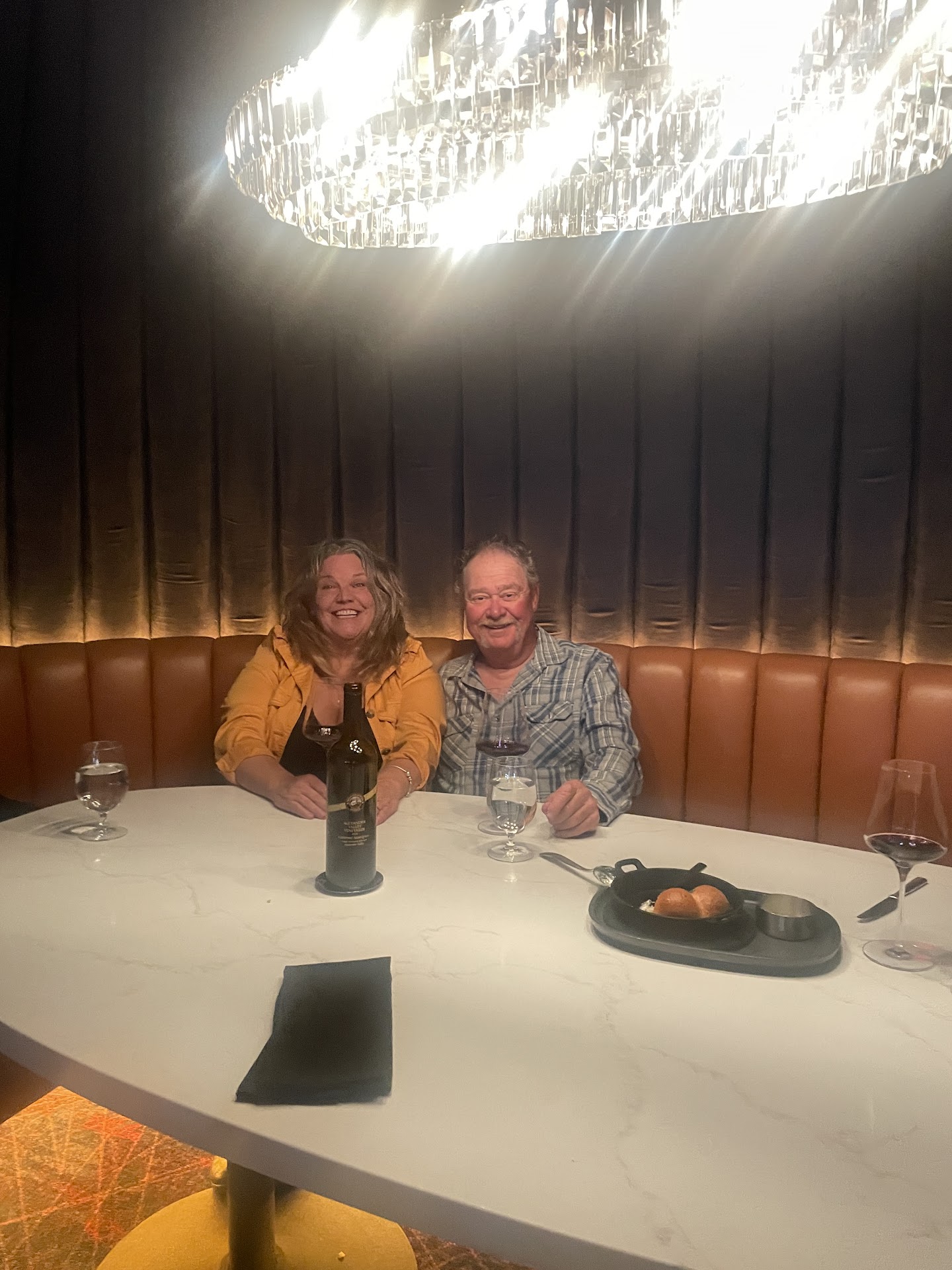 Food: • The Caesar salad was underwhelming (4/10)—it needed more dressing, and the croutons weren’t great. • The crab cakes, on the other hand, were amazing! • We both had the Beef Wellington, which was very good, though slightly under-seasoned in both the beef and the duxelles. • The mashed potatoes were rich and flavorful but cooled too quickly on the plate—warming the plates beforehand would be a nice touch. • Dessert was the bread pudding, and it was absolutely incredible! • Our server selected the wines for our flight, and she did a fantastic job pairing them with our meal.