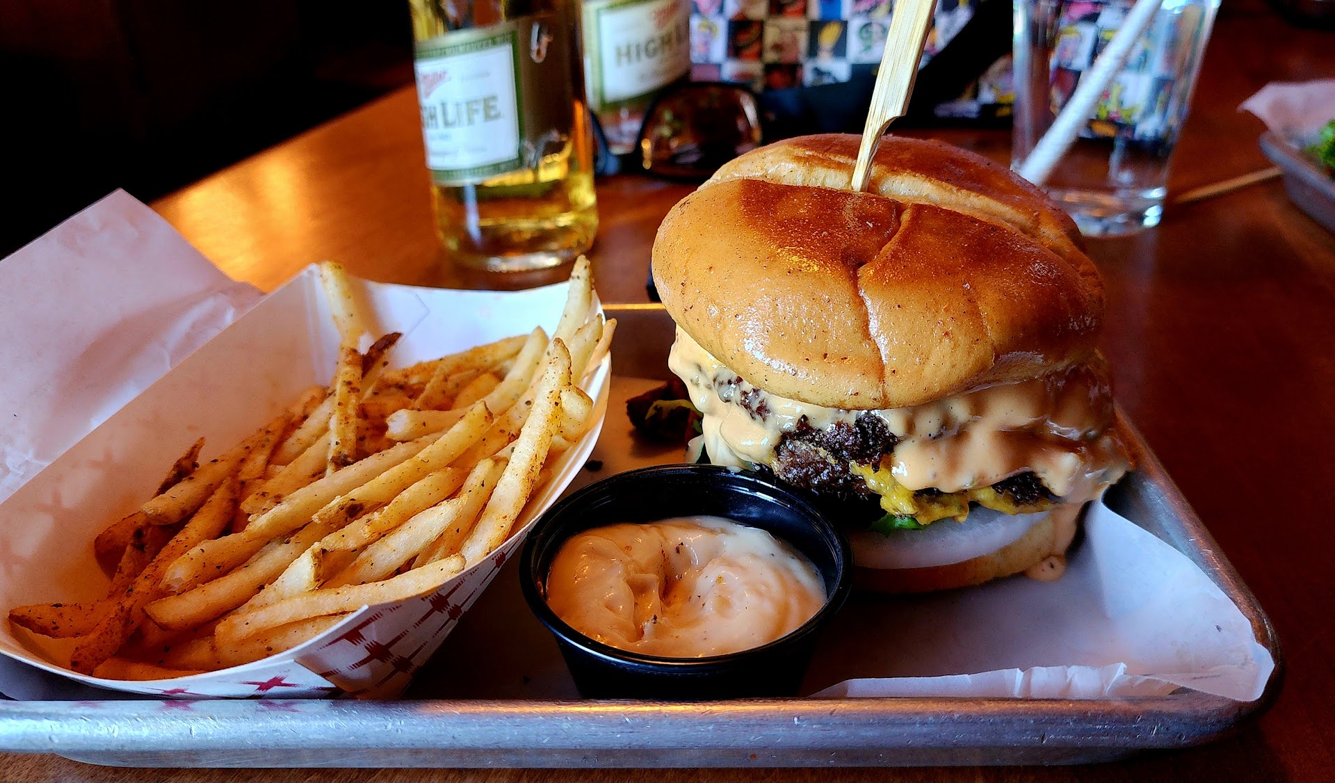 Food: the burger and fries were great. I'd order both again. My husband liked the wings (he ordered the Japanese inspired ones with wasabi sauce) but I thought they were overly sticky and I didn't like the sauce. The poutine and cheese curds weren't the best.