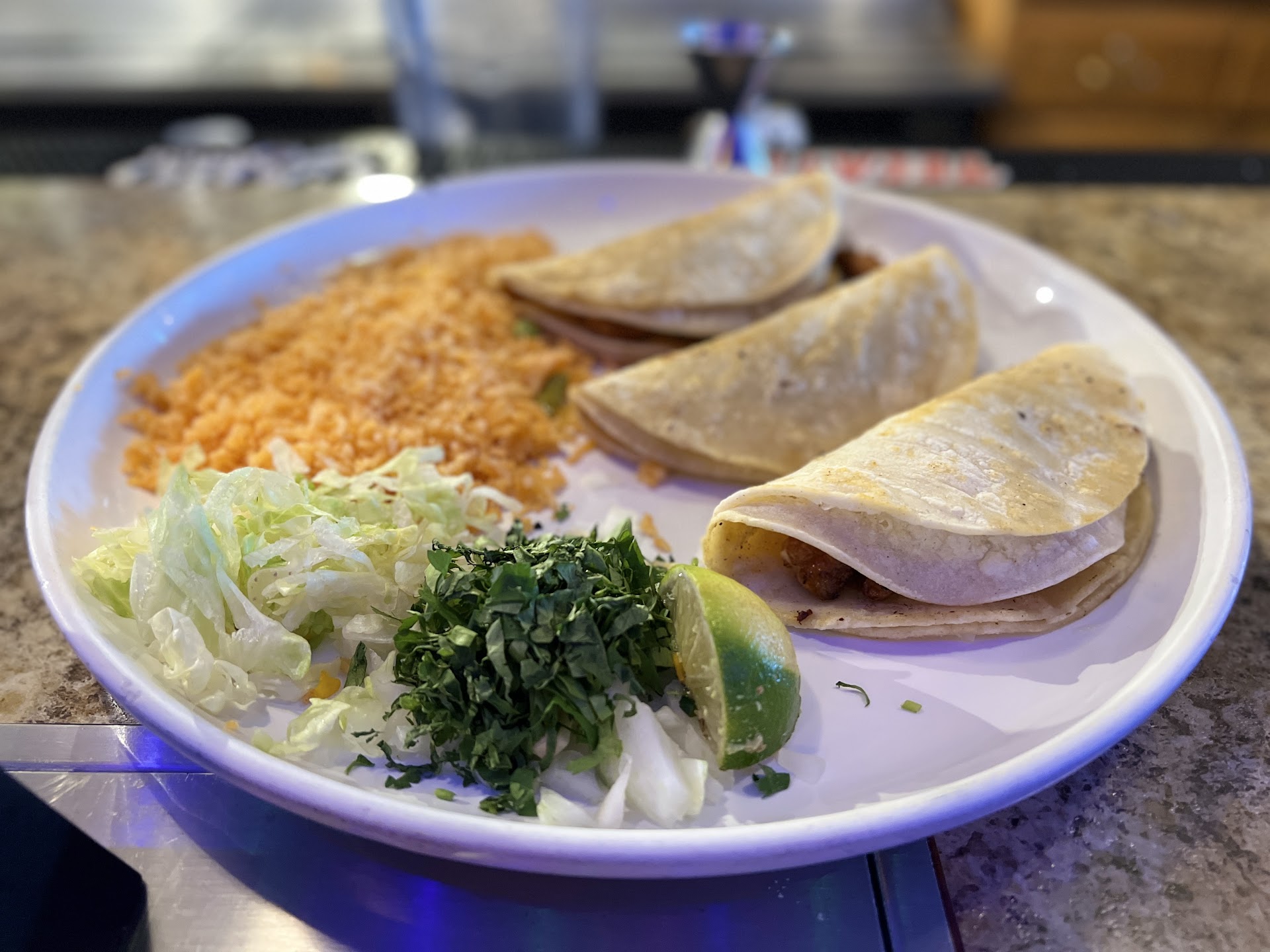 My go-to spot was packed for lunch so I kept going until I said out loud in the car, "let's go see Omar!" The man whose name was blurted out in my car is the owner, proprietor of Si Amigos. When I arrived, I opened the door and saw Omar sitting at the bar, eating lunch. I said, "Omar!" He was startled but happy to see me. His restaurant is chock-full of family recipes so choosing one item, in particular, wasn't easy. I saw molé enchiladas and ALMOST went with those but I wanted tacos. I ordered the three Al Pastor taco plate. The server offered chips and salsa and of course, I said, "yes, please." After chatting with Omar for a few, my food arrived. I was super hungry so I knew the food wasn't going to stand a chance.