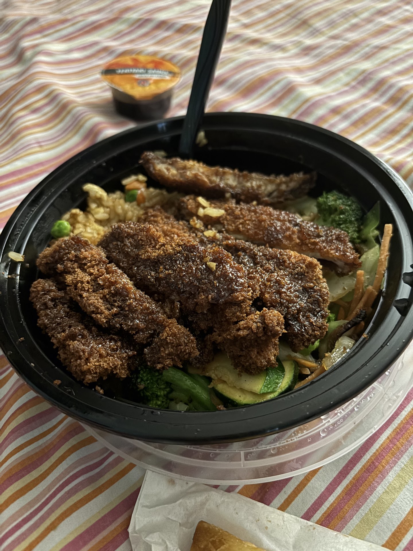 At the location the manager was exceptionally friendly and knowledgeable and he made me laugh. The gal that took my order was patient with all my questions and she kept a smile on her face the entire time while answering all my questions. Neither 1 of those employees showed any frustration, irritation, or annoyance with all my questions. The food was ready in a timely manner. I ordered noodles, veggies, orange chicken, chicken breast teriyaki, chicken egg roll, and a LG drink. The food was on point, made correctly (no onions), and was hands down 1 of the best dinners I've had in a long ass time!! Very grateful I decided to stop in for my din din!!