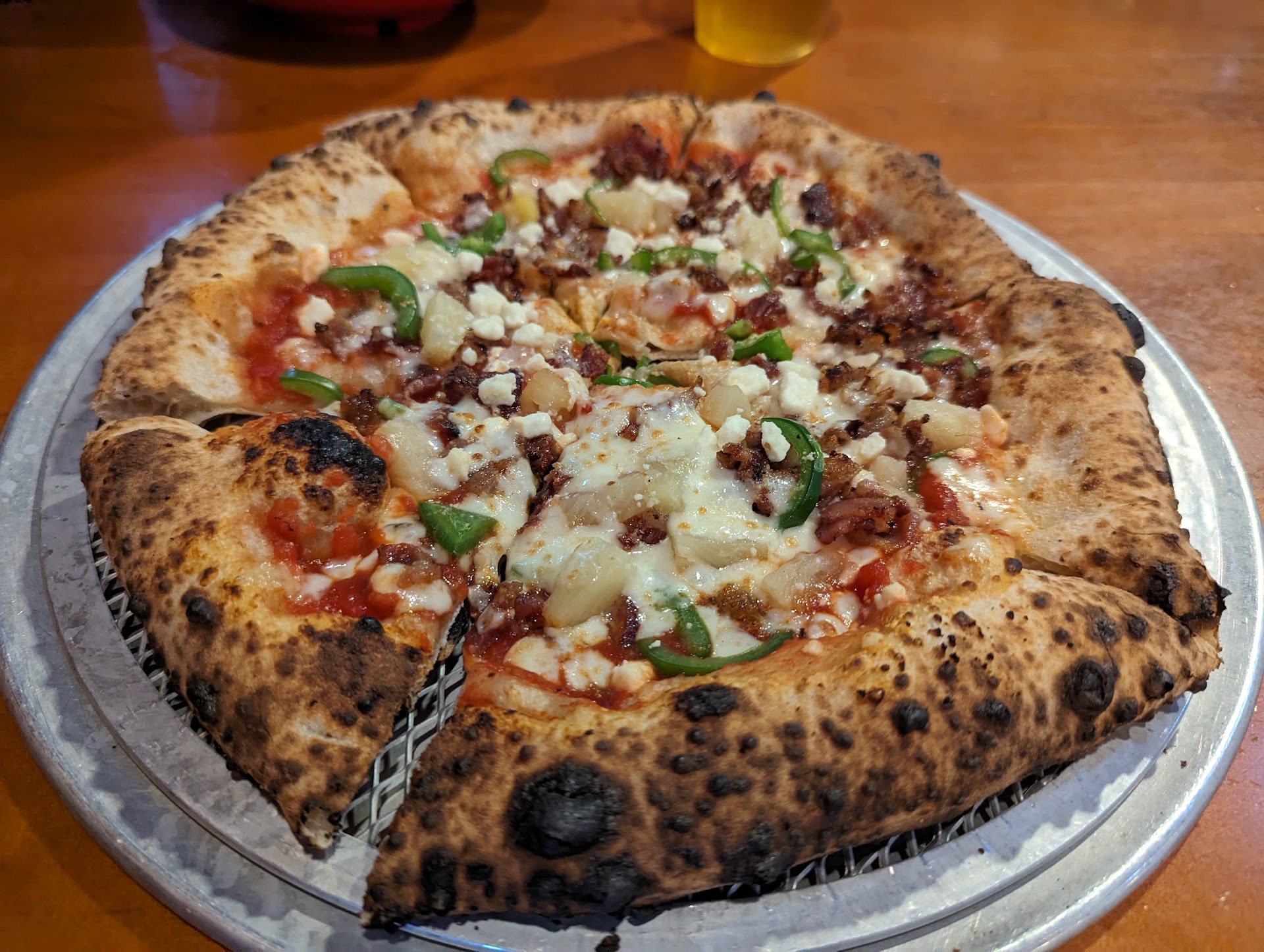 The dough is sourdough. The crust is chewy with the right amount of char. And the toppings are very well balanced. (If theyâre making a balsamic reduction, have them sprinkle some of that on your pizza. Itâs ridiculously good.)