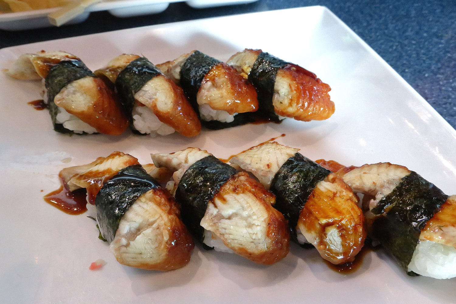My only thought is the philosophy on micro-size Nigiri is two-fold. 1) With smaller pieces, people are much less likely to "over order" and not finish eating what they ordered. (I went through three rounds of orders - about 20 orders of nigiri and 3 rolls.) And 2) you sort of psychologically start to feel "greedy"/awkward placing so many orders!