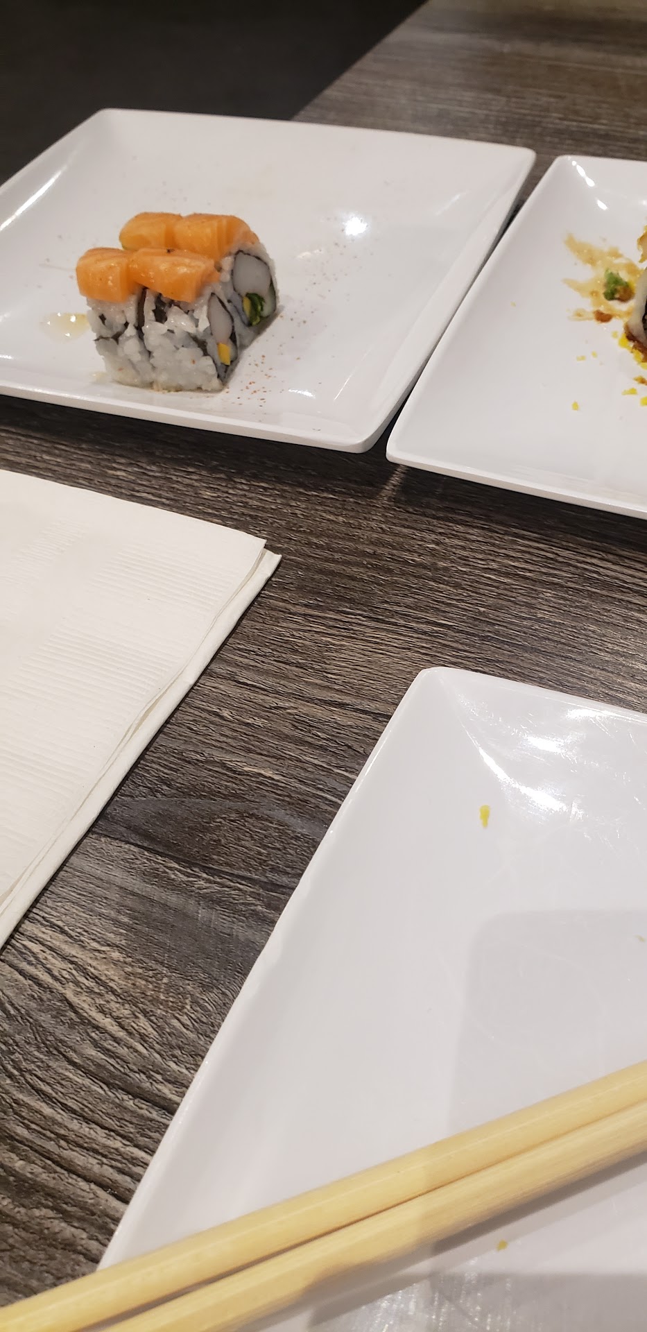 As for the service.. unless we order take out. We will never go again. The customer service was much better after I said something. Why bother asking if we're all doing AYCE if you're going to have us ask for new order paper. Or possibly not have us stacking our things repeatedly because we clean up the other two tables around us but ignore ours. I grew up in the restaurant business. I get when it's busy rush hour but it was not. Others on both sides of us were taken care of without request of needing anything. Repeatedly might I add. I tried to be patient and understanding and I've maybe said something to a restaurant once or twice before. My husband didn't appreciate me doing so but I also didn't appreciate the service or lack thereof. We sat with our first rolls plates empty for 5 mins plus before having to ask for a new order paper. Meanwhile, that was when most of the other tables had left. They were chit chatting which I have no issues. Just make sure your people are taken care of first. That's what I was taught to provide good service and get a decent tip from it anyway. The other server was kind and helpful after upsetting the other one. I do appreciate him. The girl smirking and chuckling as she continued to hand me the new plates of sushi instead of setting them ON THE TABLE where they should be placed. Extra professional on being petty.. I don't work there... I was supposed to have a night off ANY dinner...