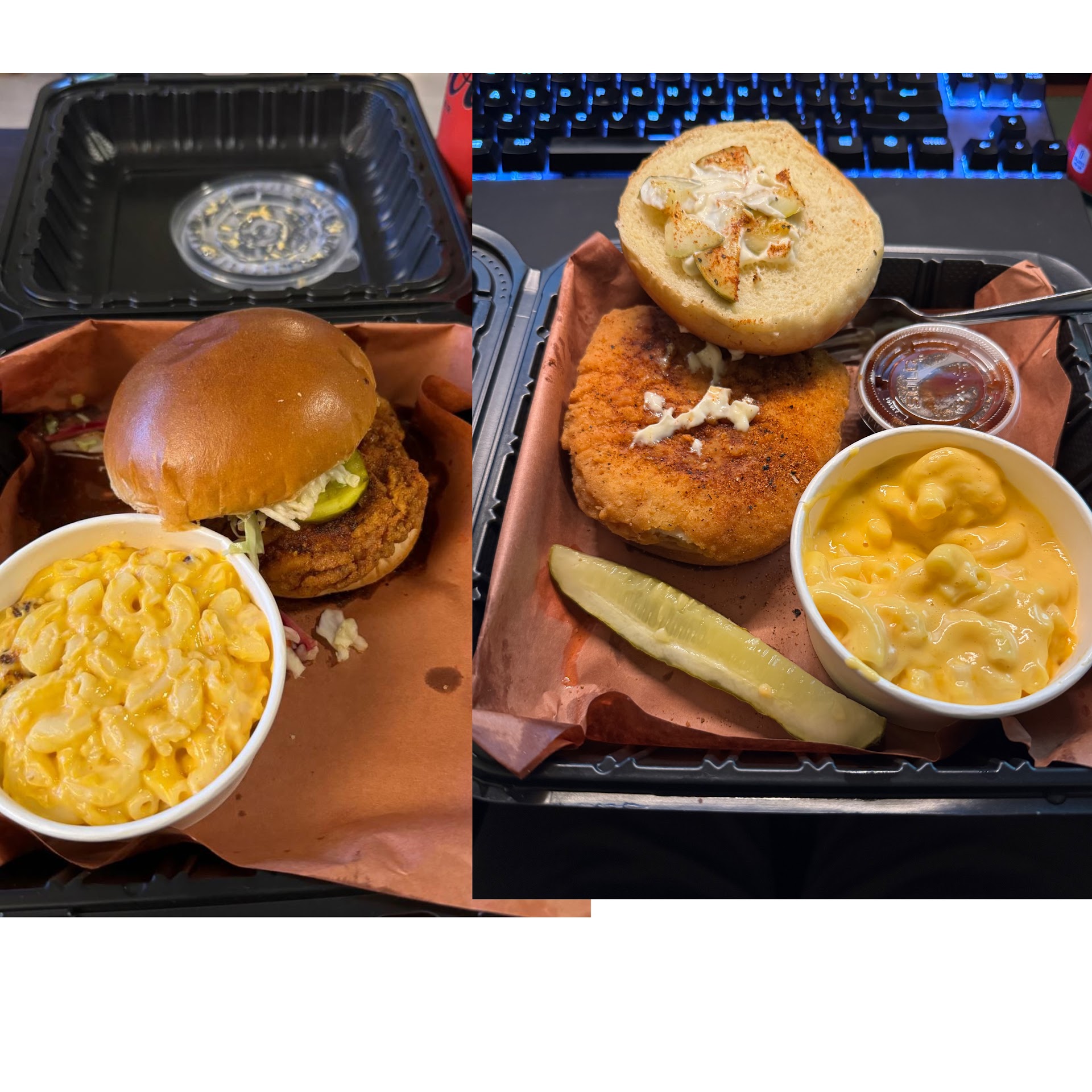 Read moreThis place has been frustratingly close to very good for years but the quality is just too inconsistent. The left side was from a weeks ago and right side is more recent. Exact same order but the difference in quality is staggering. The first order was delicious but the second was terrible. You can tell in the left picture the chicken was actually breaded and fried in house whereas on the right it’s super obvious this was a frozen chicken patty from a store (tasted like it too). There was zero hot honey on the Hot Honey Chicken sandwich, I didn’t order mayo but got it anyway, there’s no coleslaw or fried onions even though I ordered them, and I got tiny pieces of chopped pickles instead of full slices like originally. The mac and cheese is also very watered down and runny compared to the first order too. The first one is absolutely worth the $20 it costs but the 2nd one wasn’t worth even half that.