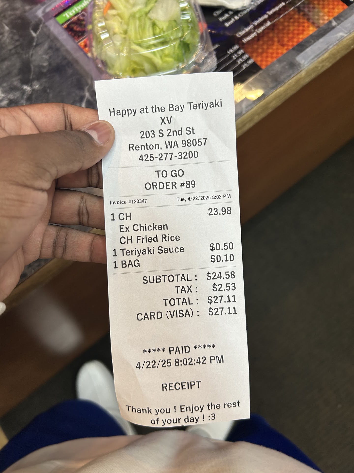 I went in to get food for my family of 3. I ordered a chicken teriyaki with extra chicken, expecting a small upcharge. Instead, I was charged $27—for just one plate. Confused, I calmly said, “I think I was overcharged.” Nothing more. I wasn’t angry, I wasn’t rude—I just wanted to understand.