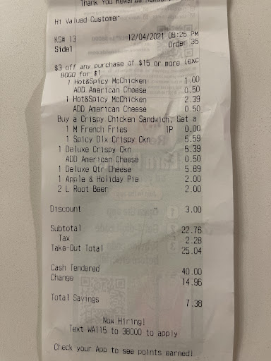Read moreI came through the drive thru 9:25pm on 12/04/21. My drive thru order server was Alyssa. I was only able to say two things out of all the things I wanted to order and she said my total. I told her nicely that I was not done ordering and after each item I ordered after, she kept telling me her total. I could easily tell in her tone of voice she was annoyed, but at the end of the day, I was still not done ordering. She then continued to raise her voice and saying the total. I was almost done ordering but not just yet. I had two drinks left to order. In the exact words, I said “I was going to order 2 large root beers, I was not done yet,” and she replied “Were you going to order that or is that what you want?” At that point, I was already irritated. She said that in such a harsh tone of voice and in a loudly manner that when I drove up to the first window, she wasn’t even there to go over my order that I had placed so I had to drive to the second window. There, I had to go back and forth to use my code for a deal. They didn’t read over my order and instead just charged me. The order was not entirely wrong but she charged me for an extra burger for no reason and one of the sandwiches was not even spicy which I specifically asked for. This is by far my worst experience ever as a McDonald’s customer. All I wanted was to get a quick dinner for my fiancé and I after a long day of work. Please help me make this right as I do want to continue being a customer at this...