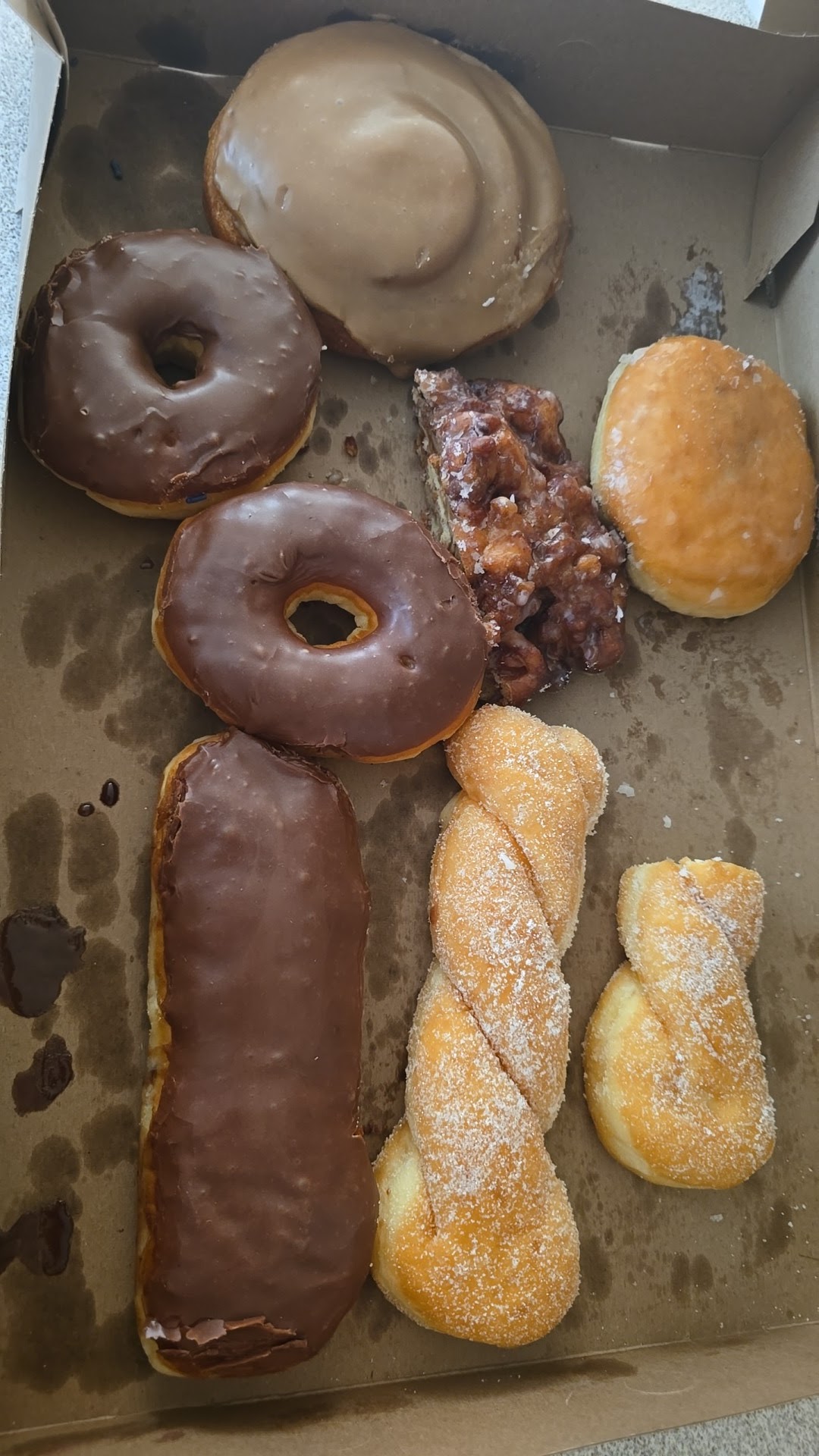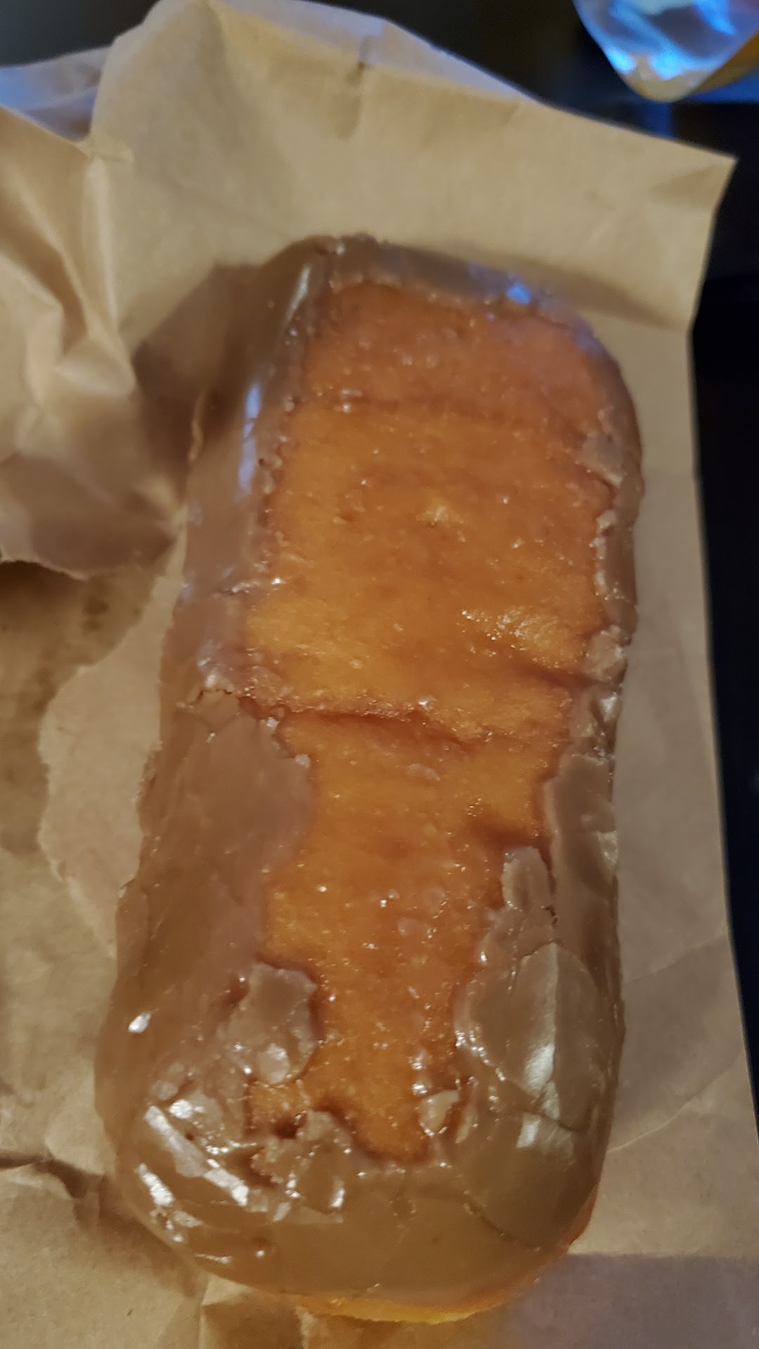 I could not wait and had a maple bar eaten before I got to the stoplight, I couldn't resist as resistance is futile and had another donut as we drove away from the stop, I managed to get the box closed and got home, I am now enjoying a Apple Fritter while my Wife eats a Twist, my Dad will probably eat 1 or 2 and they will probably all be gone by tomorrow, as it should be with Fresh donuts.