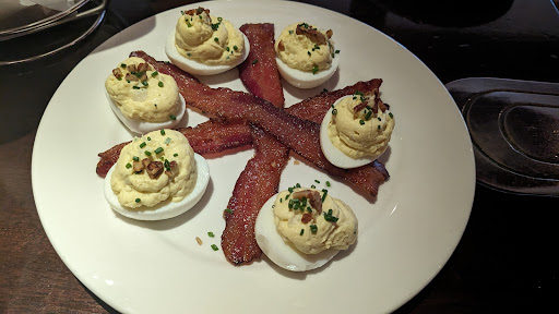 Deviled Eggs 2/3 It was okay, will not order again. The bacon that came with it was really good though. The eggs themselves were just okay, nothing too special. They have larger chopped celery (I think) mixed in with the eggs which gave it texture which was pretty different. It also had walnuts on top which my husband wasn't a fan of, but I didn't mind it.