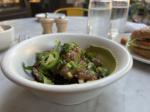 Had been excited to eat at this chain since I walked by it in Annapolis, so while I was staying here for a work trip I thought it’s kismet I should do it! I’ll start off by saying it’s wasn’t actively bad by any means, but if I’m paying $70+ for two entree’s and an appetizer, I would like it to be a) an experience/fantastic service, b) exquisite food, or c) both.. and this was honestly neither. The service was meh and the waitress just didn’t seem engaged or too attentive to the water situation sitting outside on an early august day at 5pm The food was fancy ingredients but I want to say like Panera level preparations for some of the items. We got the street corn and the corn cobs were just dried, small and knobbly slathered in butter- no bite or kick, needed more lime.. I understand they can’t control the corn crop lol but at least advise ā€œthis item is better at xyz time or our supplier didn’t have the best crop this weekā€ idk.. but it was halfway between corn on the cob and those dried out Halloween cobs you put on the porch. The poke bowl was interesting in concept but lacked depth in flavor and needed some doctoring. I was expecting elements of umami and maybe some sweetness but all I got was fish and heat, and the forbidden rice was not cooked properly- I even googled forbidden rice while eating it to check if I was crazy. Sandwich was ok but over priced, but the sweet potato hash was mushy and we didn’t bother to finish it even though I was stupid hungry after being at a fitness conference all day. Summary: great concept but lackluster execution.. if money is a non issue for you, there’s lots of cool menu items but none of the ones we got blew our 🧦 🧦 off šŸ¤·šŸ¼ā€ā™€ļø
