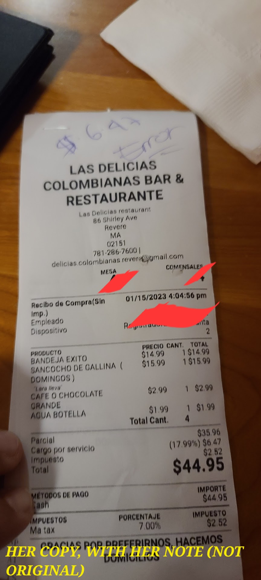 *After I queried about the service charge (18%=$6.47, she wrote "error on top of receipt for $6.47). She said that had nothing to do with my bill and also supported by the 2nd server (although the 2nd server's story was referring to credit card usage: i quote: "the error was that I made a mistake and rang it as a cash payment and not cc". Thats the 4% fee which has nothing to do with this. As well that the owner needed to know what the error was. My bill was still left without adjusting it. I paid it. I rather file a complaint with the authorities and the BBB as well with the owner and a bad review.