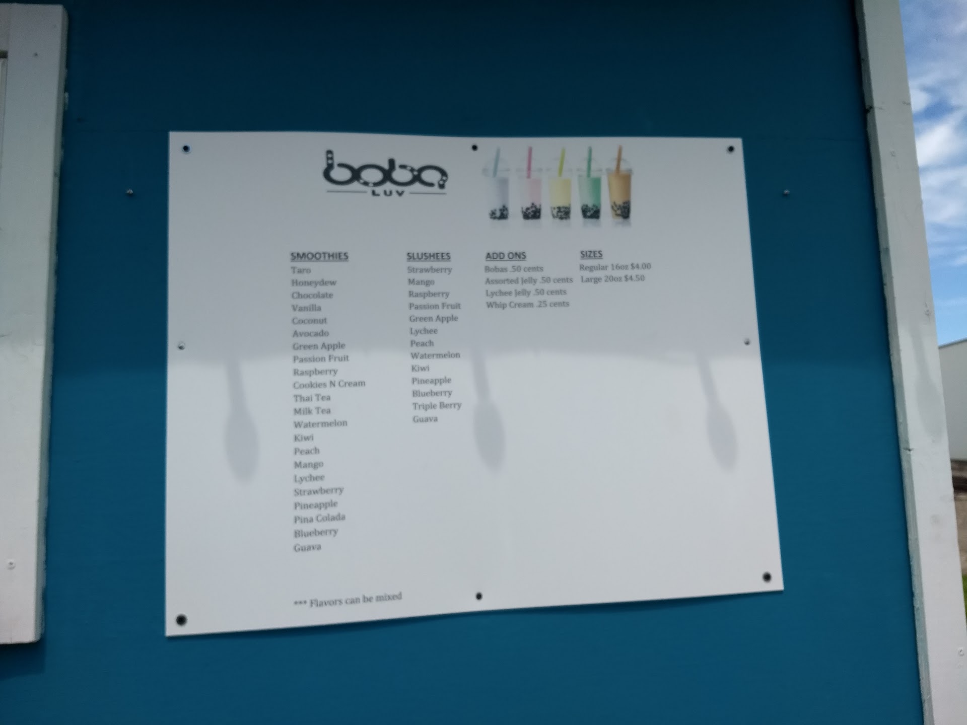 Ā Ā Ā Read moreMy fiance found this place and I was not disappointed. If you love smoothies and you love boba, you have to come here. I got a smoothie with the tapioca pearls(boba) added in and I am most definitely planning on going back many times. The smoothie was well flavored; not too subtle and not overpowering. It's a small detail, but the cup it came in was sturdy and the lid does come off, but not easily. Some boba places I've been to before, their cups felt rather thin and they didn't come with a lid, it just made me happy that Boba Luv's do. It you've had boba before you may notice that the pearls start to freeze after a little bit of being in the smoothie. These ones still do, there really isn't any way to get away from that, but I noticed that it took longer for them to get to the point that you couldn't get them with the straw. I like it when they freeze, but I know many don't. So if you want to savor the flavor and enjoy the boba, you don't need to cause yourself a brain freeze doing it. But if you like the firmer feel, you can have that too. Very reasonable pricing and the hours are perfect for practically any schedule. The lady who was running it when we went was very kind and you can tell that she enjoys what she does. It did not take her very long to get two smoothies out. If it's more busy, it would probably take longer. There are lots of flavor options and you can pick up to three to combine and enjoy. Honestly the best boba...