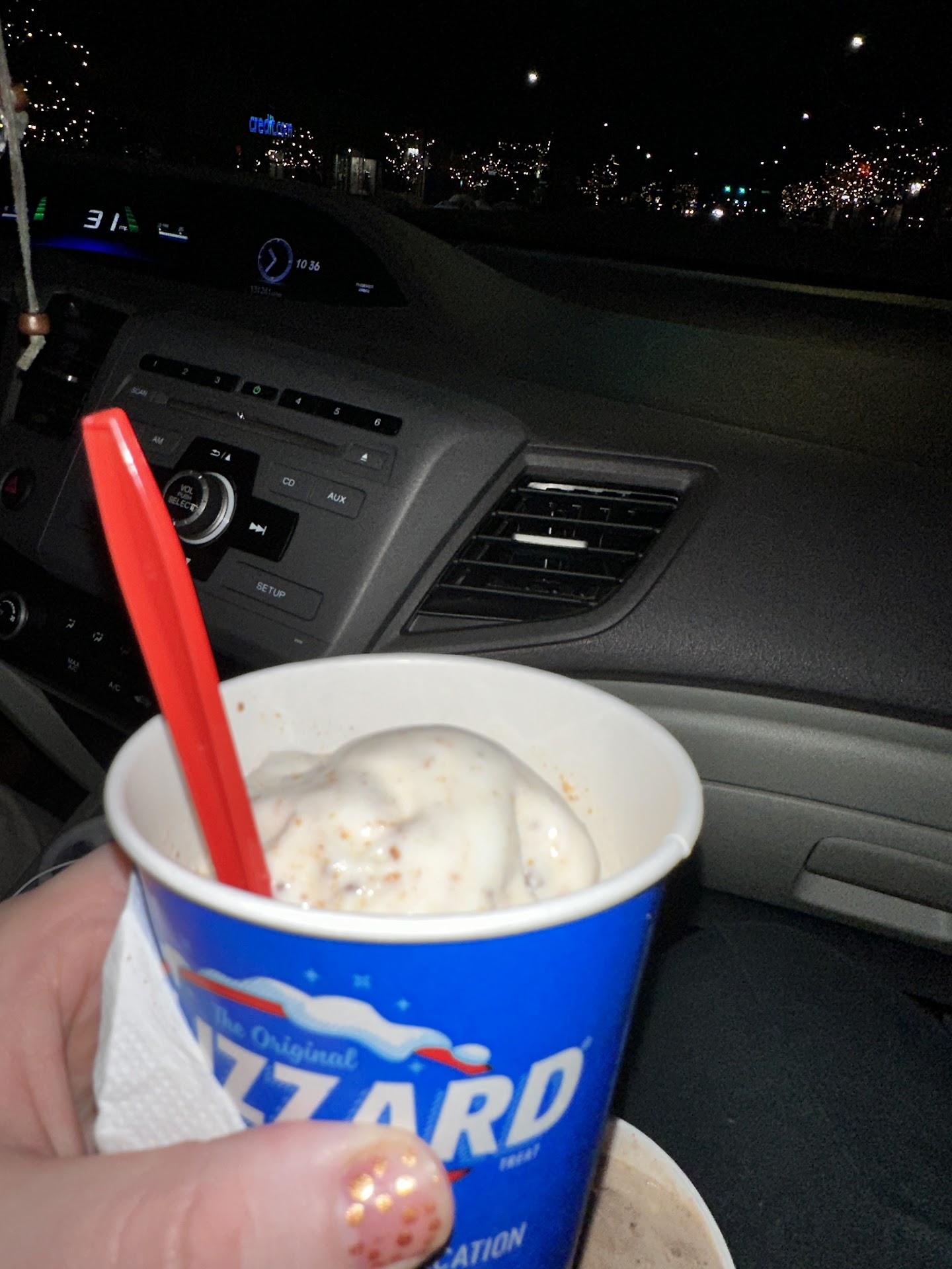 Blizzards were good. Mine had drips all down the side of the cup. Not sure how long mine sat before the other was completed. But they sure didn’t use mine as the example flip upside down presentation at the pick up counter. Finally, there was a smell in there I couldn’t describe. They either burned something in the over or an oven type cleaner was dispelled. My wife said it smelled like gas and I thought it resembled the oven cleaner smell at home. Either way I heard three others comment it too while in the lobby. We decided to eat after a few minutes in our car because you could almost taste whatever...