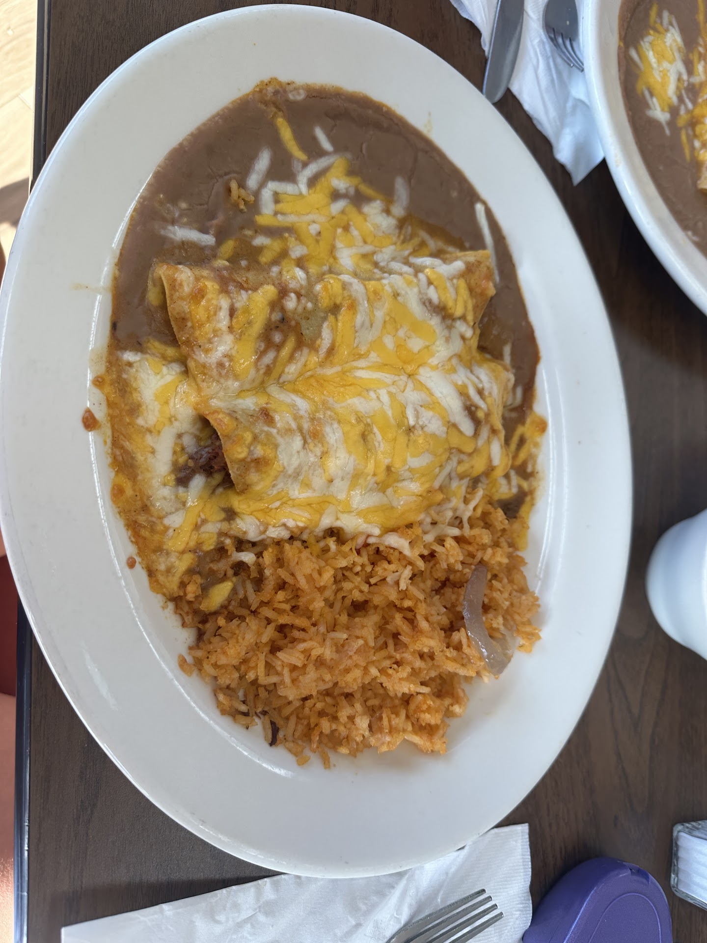 I had the Chipotle chicken burrito, a rather slender meat only burrito, covered in chipotle sauce and drowning shredded cheese, served with Spanish rice and the average pinto beans.