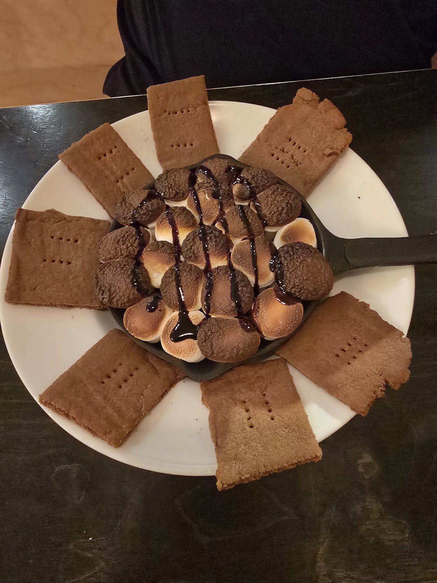 The food was delicious. 😋 We started our meal with Spinach Artichoke Dip- Husband had the steak, mashed potatoes, green beans, and a side house salad- I had the chef special which I believe was a butternut squash carbonara with the side house salad- then we had the s'mores skillet and a pumpkin cheese cake. (Of course we have a great amount of left overs.)