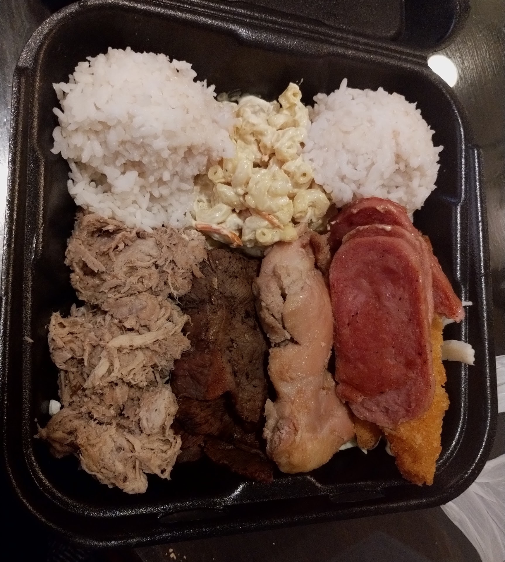 Rice had both soggy/mushy and dried out sections. Misoy chicken looked barely cooked or marinated. If it was marinated it wouldn't look or taste like the same color of bare chicken. There were no grill lines or hot pan heat marks. Katsu and bulgogi beef were really tough that we just gave it to our dog who could tear it up. The katsu sauce doesn't compliment the food at all. It's sour. Better to just use original katsu sauce or substitute with BBQ sauce. The bulgogi lacked flavor, especially if they say it's marinated. Kalua pork didn't even taste like it had salt which is a main ingredient!? Mac salad was just inconsistently cooked macaroni with mayo. My sign of quality Hawaiian grinds is how good the mac salad is. I should've just started there to know the rest of the meal wasn't...