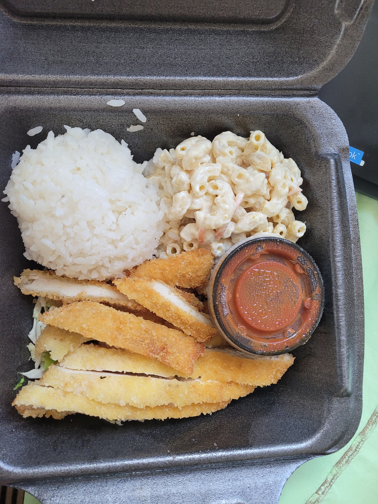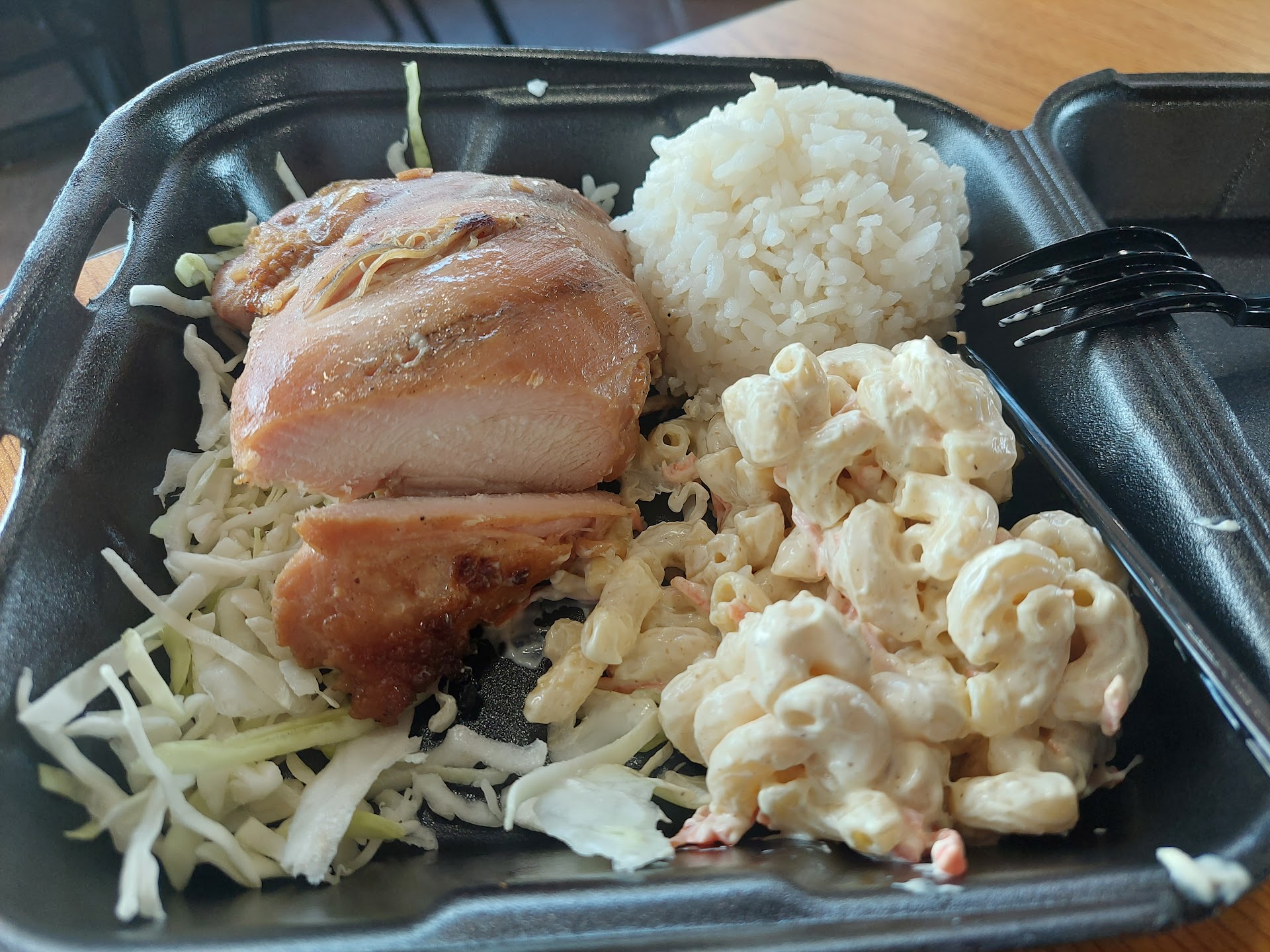 Full: It's a clean place. Kind of hard to find if you're just passing by. The design did not affect the score at all, but the logo and lettering is a bit tricky to see (for the designers there, they might get a giggle for having Papyrus as their font for everything. Like, everything.). The food came out fast. I was very pleased. I got their large combo meal to try out their meats, and they still got it fast. I was very impressed by that. However, like I mentioned above, for a Hawaiian place, it's not the best but it's also not the worst. I felt like it was in between. At least from what I was served, some of them I really loved. Some of them I liked. Some not at all. Their greatest meat I got to taste was their grilled chicken. It was cooked to perfection, and it was very savory. I didn't need to dip it in the sauces provided, so I was very impressed. I forgot what it is, but it seems to be their beef. That one was a good bite too. Their kalua pork was okay in my opinion. Another place around the area has a better kalua pork. I'll include the mac salad too. I thought it was okay, but not the best. The one that disappointed me was the chicken katsu. It's probably always cooked to perfection, but I got a bad one in mine. The chicken was rubbery. It didn't have that nice texture that goes along with the crunch of a typical katsu. I would like to try another chicken katsu later and change my mind about it. But for now, I would say that I did not like the katsu I was served. One thing that people might find different about this place too is that it would cost you more to get more sauce. It didn't deter me, but for some, it might be a deal breaker. I think it's definitely a first for me seeing a Hawaiian restaurant charge more for sauce, but that maybe I just haven't been to a lot of Hawaiian restaurants.