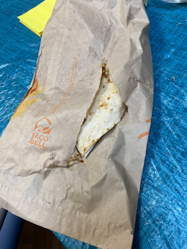 I then get back to my job, and open up my bag only to find none of the tacos properly wrapped up, my quesadilla was in a ripped bag ( so unsanitary) also the cheese wasnât even completely melted in my quesadilla . I also paid for 3 sour cream sides and only received 2, one of which was open in the bag.