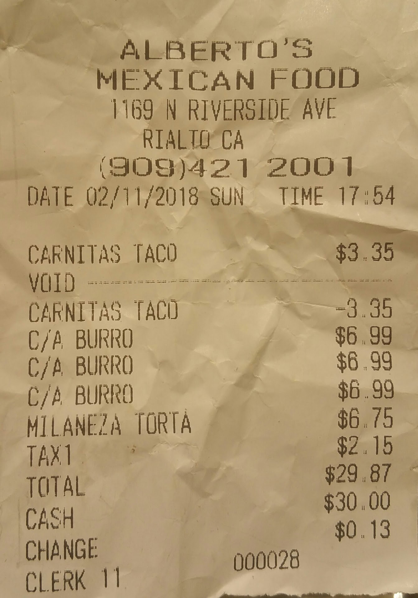 Their burritos are a little bigger than the burritos from Miguel's Jr. That's the only good thing I can say about their food. They don't taste very good and it's difficult to finish them, not because they're too big, but because they don't taste that good. The only reason my husband went there tonight was because it was raining so hard, he didn't want to drive all the way to Fontana for burritos. Big mistake. He ordered our (bland) burritos and then asked for a side of chips and a side of guacamole. They gave him a container full of chips, with cold cheese and guacamole dumped all over it. What a nasty mess! (See pictures) It looked like someone's week old leftovers, and the guacamole was already brown. He went back in and explained that he didn't want all that conglomeration, just some chips by themselves and a side of guacamole by itself. They offered no apology, gave him no credit for the pile of garbage they had already given him, and then they said, "you'll have to pay for those!" So he ended up paying for their mess and then paid a second time for the chips and guacamole. Once he got home, we opened the chips and found they were covered in cheese and looked old and nasty! The guacamole was old and brown already, like before, and was filled with diced tomatoes - more tomatoes than avocado! We threw it all away and he didn't go back. He said it's not worth the effort or the expense for them to try a third time to get it right. Alberto's definitely won't be getting our business again! The food and the customer service stink! EDIT: I tried six times to upload a picture of the nasty, brown guacamole, but apparently they don't want it shown. Wow! I thought Google was...