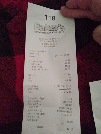 We were on our way from Big Bear Lake to work on a house in Rialto and made a pit stop at Baker's drive thru and placed an order for 4 people, we all got large combo meals, I got the Carne Asada burrito with fries and a large coke. The person that took our drive thru order was very pleasant and made sure that everything was correct with the order before proceeding to the window to pay, it took about maybe 30 to 45 seconds to get there and were greeted with a friendly face and a big smile, she read the order to us to make sure it was correct, and it was, then paid by card and within a minute the drive thru window opened and was handed the receipt and card followed by our order and couldn't believe how fast that was from start to finish!! We got to the house a few minutes later and couldn't wait to chow down, the aroma of all the combos together was making my mouth water like Niagara Falls!! I scoffed my fries down first and saved the best for last, the Carne Asada burrito, OMG! Every bite I took had a chunk of steak in it, so tender, so juicy, so effin good!! I'm so pleased we went there for our lunch. My burrito filled me up when I was half way to 3/4 of the way through it and didn't want to waste it so I ate the whole thing and enjoyed every single bite. These guys...