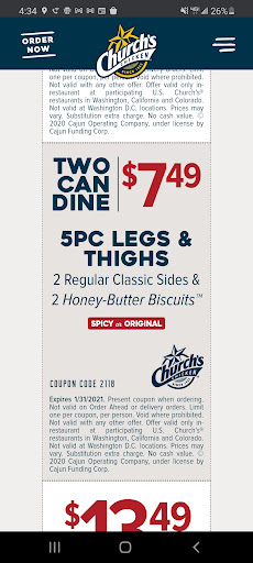 Read moreChurch's chicken is fire đ„ specially fresh of the oil. Yes alot of people think its greasy as hell but what fried chicken isn't??? Yeah, exactly my point! Chicken is always on point and very delicious! Since church's is always packed i know for sure they don't let their chicken sit out for a long time like KfC OR POPEYEs. I usually order with coupons here and its always a good buy specially for a big family, me and wifey get the (2 can dine for $7.49) which includes 5 piece original 2 sides and 2 biscuits which is enough for both of us, then I send my son out with another coupon (20 piece leg and thighs for $19.99) and would be enough for my 5 kids. So $28.00 bucks will feed an army of 7 lol overall if your in a hurry is best to get of the car and walk inside and order, drive thru can be hectic for sure a 20 min wait thats why I rated a 4 star. Thats the only flaw they have. But chicken is great! Great staff very polite and will hook you up with condiments when ask...
