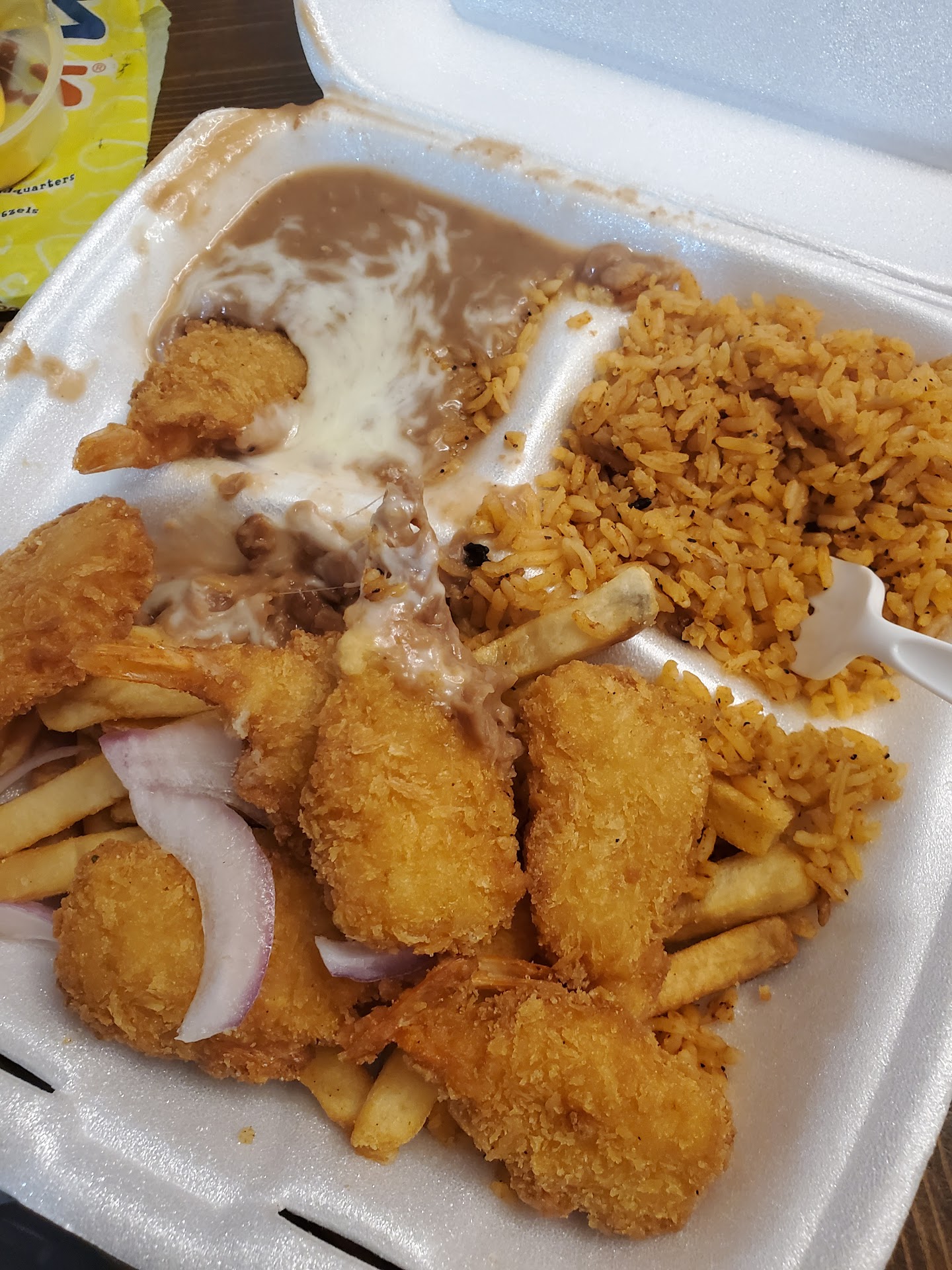 I really wanted to like this place but it did not meet the reviews it has. I called to place order and they said it would be ready in about 315 minutes. I show up on the 35 minute mark and the food is ready. The cashier is kind and super welcoming. We pick up our food and drive home and as soon as we open the bags, it smells like burnt. I ordered two shrimp combos and the rice was burn, you can clearly see, on both combs. So the rice was not eaten and it literally taste like burnt pan. Next, the fish tacos and shrimp tacos were 3.99 each one. I don't mind paying for food I will enjoy but these tacos were so dry and dense. They had not flavor, the salsas were good, I will admit that. The fries were soggy and there was just so many things wrong. I really didn't want to leave this review. The cashier and restaurant seemed so nice but sadly their food is not as good as their reviews. The rice ruined my whole experience, I kept an open OPTIMISTIC ATTITUDE but the taste test failed. I won't buy...