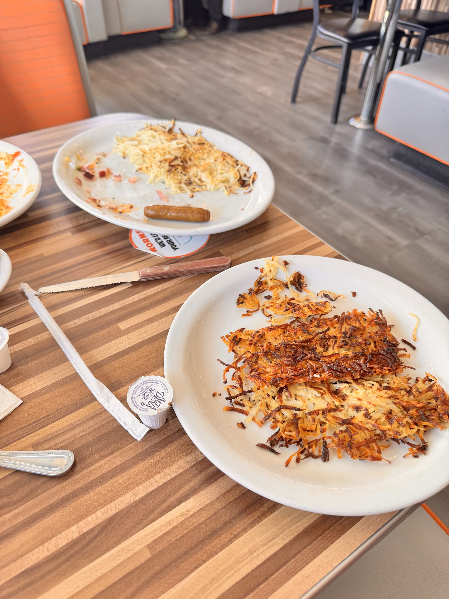 I called our waitress over and politely asked if they could be replaced. She was very accommodating and quickly brought out a new order. However, when the replacement hash browns arrived, they were completely burnt—so much so that I couldn’t even cut through them. At this point, I called the waitress back and asked to speak with the cook, as it felt like someone in the kitchen was playing games with our food. She mentioned there were multiple cooks in the back but offered to bring the kitchen manager instead, which I agreed to.