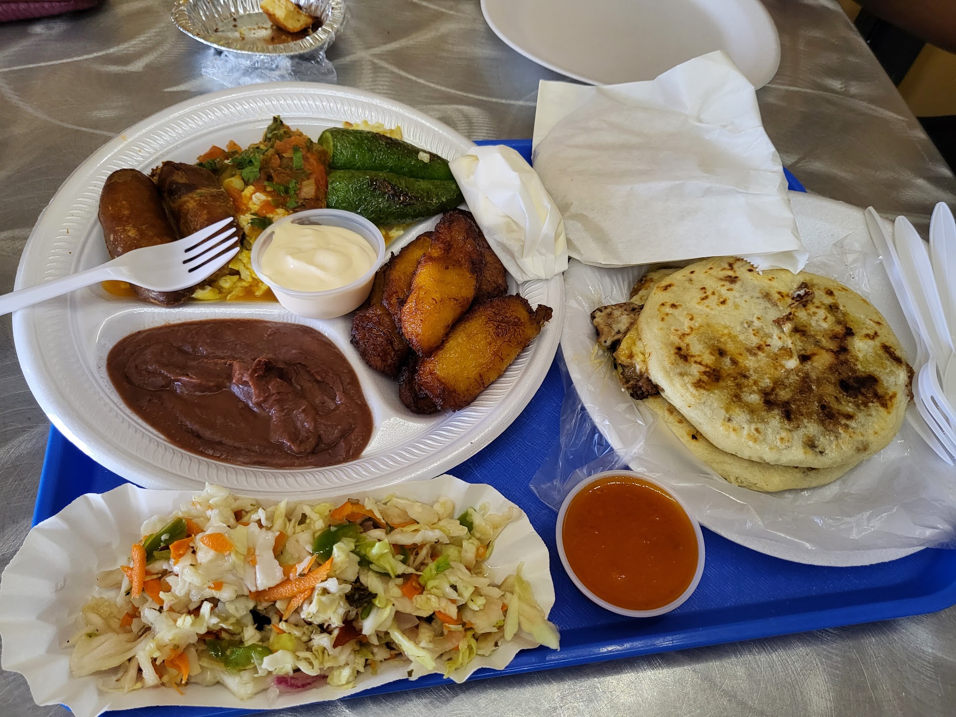 Read moreCame here on a Sunday at 2:30pm, while my kids and I craved pupusas. I walked in with high expectations from prior reviews. Upon walking in the cashier was busy handling food delivery service orders...no big deal. I asked her if we sat ourselves and then they would take our order she said yes. We started looking for a place to sit so they could take our order.. then an older lady asked us to order at register...again...no big deal. As I started ordering the lady started mentioning that the platter that they have advertised are not correct. The platter "Tipico El Rancho" is advertised with rice, she said "no, no lleva arroz, pero si dice, pero no" ok fine. Ordered 4 pupusas, 2 bean & cheese and 2 cheese...again, menu states pupusas are 3.75 and the upgraded are carne asada and pollo..an extra .75...again, no big deal. I was charged 4.50 for a cheese pupusa! I asked the lady and she said I wouldn't be able to find a cheese pupusa for 3.75....it was literally advertised as so on their menu! Ok, we ordered the food and waited for a table to be cleaned up, asked one worker...waited 10 minutes asked another worker..finally we're able to sit down. When the food came they only brought the Plato tipico and 2 cheese pupusas then proceeded to bring 1 bean and cheese one 10 minutes later...another 15 minutes passed and my daughter had to go ask for the 2nd bean and cheese pupusa.
