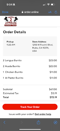Read moreDos potrillos used to be our go to, and I'm not one to complain but until we received horrible service from the manager Yolanda. We won't be coming back. We made our order online first thing in the morning to be picked up at 9:20, showed up 10-15 mins later and she did not want to admit she gave the order out to the wrong person & kept claiming we ordered through DoorDash when we used their site directly which shows they are using DD as their checkout method and she figured it was automatically meant to be delivered when I had my receipt and specifically said takeout/pickup. Please train your managers to know how to use their online order system because even her cashier knew she was wrong but didn't want to admit it to her manager. I tried to be patient and explain to her as I have worked with fast food before but left with me with no resolution of the problem after almost an hour of back and forth had to dispute my order with the bank. If you order please call and pay at the register, save yourself the hassle!!! Because apparently the customer is never right here. How funny that once I leave the restaurant, they...