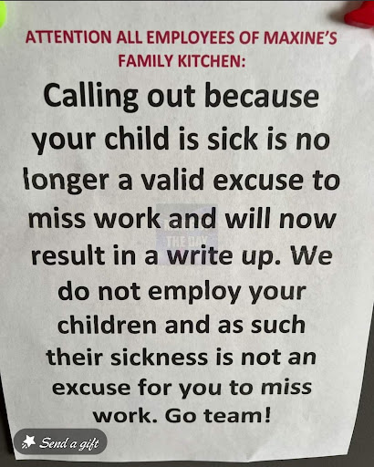 This photo has been going around on Facebook. I noticed it today 6/9/24 and their is alot of mix reviews but me as a parent is against it. Unless your workers are calling out every day and using that as an excuse then I can understand the true meaning of this sign. However, if a child is sick every several months and the worker can show proof of such a doctor note that the child must stay home then that's different. But if a parent have a child with a disability like autism and have unexpected outbursts and needs to leave work early then that's different. But you as the owner cannot take a parent responsibility away when it comes to that worker family. You at least should show compassion and a understanding that family emergencies comes 1st. And if your pay is not great either then there is no need for any living soul to work there including highschool students and have your long time business close for good. Perhaps you might wanna rethink about this sign, cause unless this sign applies to you and yours(family) when a loved one gets sick then your only looking out for the best of interest for yourself but not your employees. People don't leave bad jobs, they leave...