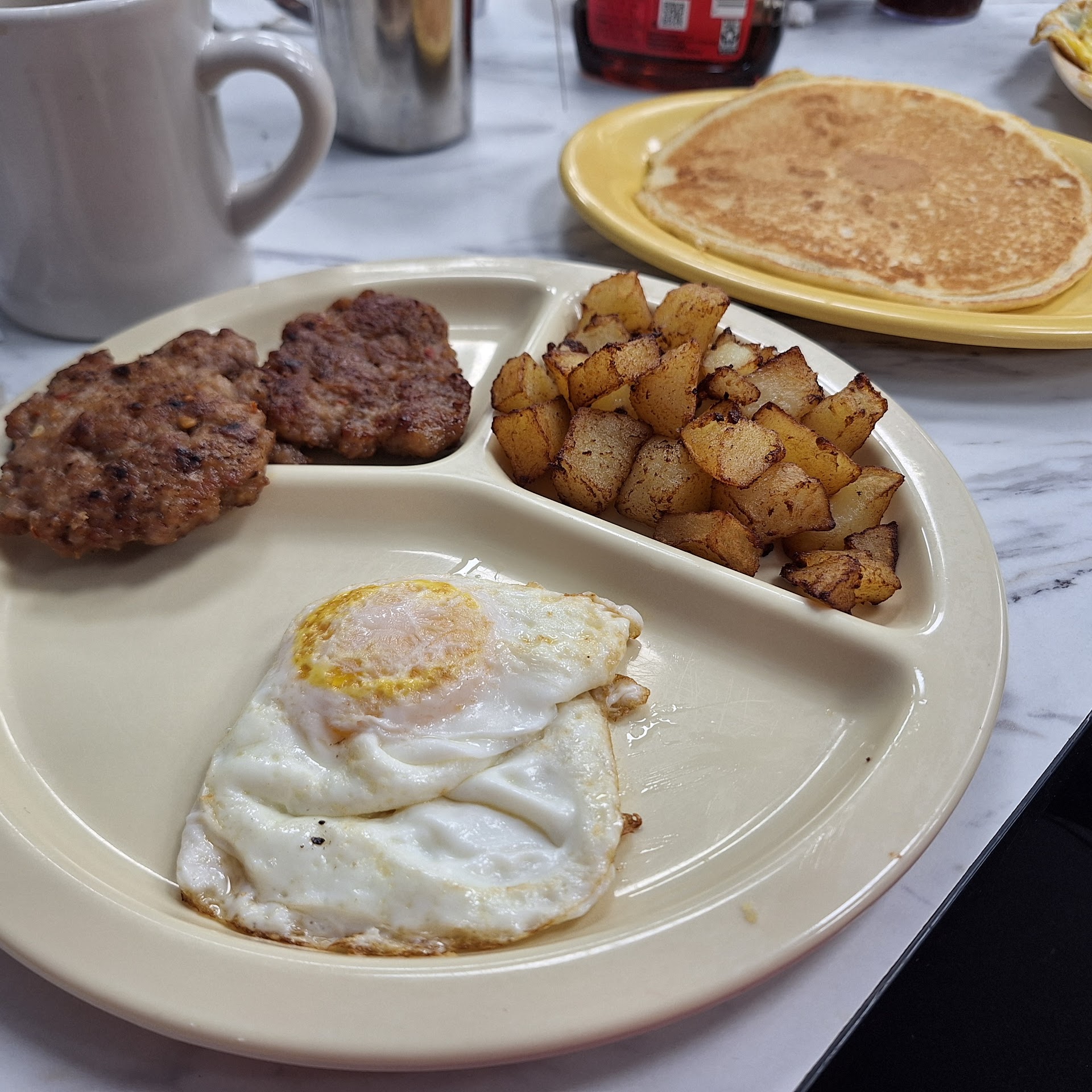 Everything you'd expect from a small town diner restaurant. Great food, good process, friendly staff AND fellow customers. The coffee was good, the food was hot and fresh. The sausage tasted homemade,. The pancake was perfect. It wasn't soggy. It had that little bit of crunch to the edge from where it had been cooked with butter. The portion size were spot on, too. The staff was very attentive. From the time we sat down until the time we received our food was under 10 minutes. The only thing I wish they'd do different is have fountain drinks instead of bottled. For 2 coffee, a bottled soda, 3 breakfasts with add-ons it was under $40 with tip. It's quite evident went this quaint restaurant is where the locals go!