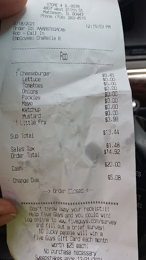Ā Ā Ā Read moreMy first time ever at Five Guys. I heard they were good. I spent $24 to find out they are not good at all. I can only assume it's just this particular location that is bad. I ordered a pickup via the website. When I got there I had to wait for the fries, then he forgot my milkshake, I had to ask for it. Strangely, the whole bag was filled with fries, but I only ordered a small one. I had to ask if the burger was in there too because it was buried under fries. Got it home to discover both the fries and the burger were soggy. The shake didn't taste very chocolate-like either. I could detect another flavor in there. Oh well, my poor experience teaches me that Culver's and Dairy Queen down the street are much better options. I'll never take a chance on Five Guys again, lesson learned. Not worth wasting your money...