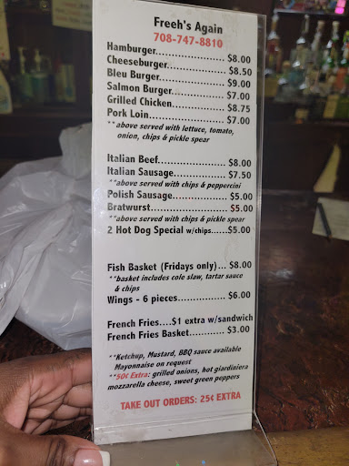 I normally don't eat burgers but I had a burger craving. My friend recommended Freeh's Again in Matteson. I had the burger with blue cheese, my friend insisted that I ask for my burger to be cooked medium. I trusted my friend and order the burger the way it was recommended to me, needless to say; I will not be taking my friend's suggestion again. Although the burger was tasty it was too pink for me. I will try Freeh's Again again but I will definitely order...