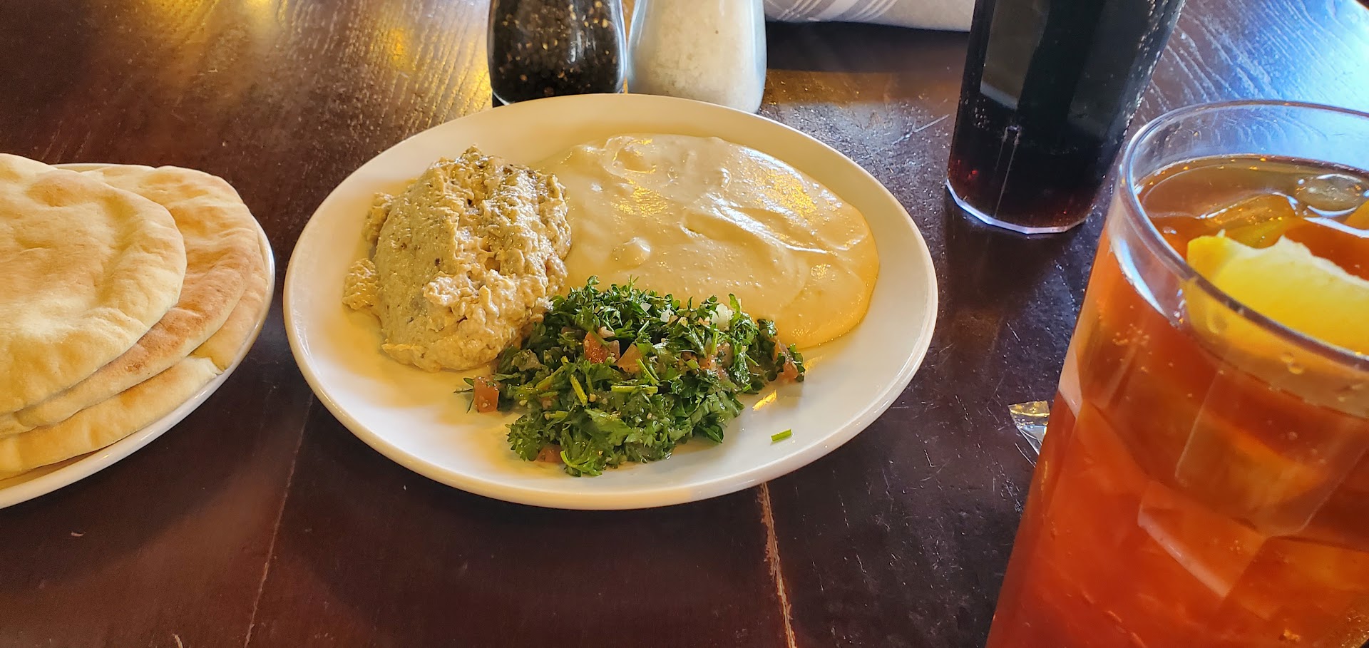 Their dinner menu has a mezza platter--an assortment of baba ghanouj, tabouli and hummus. Their chicken, beef and lamb kabobs are phenomenal. Also, a light layered phyllo pastry with an assortment of nuts--baklava.