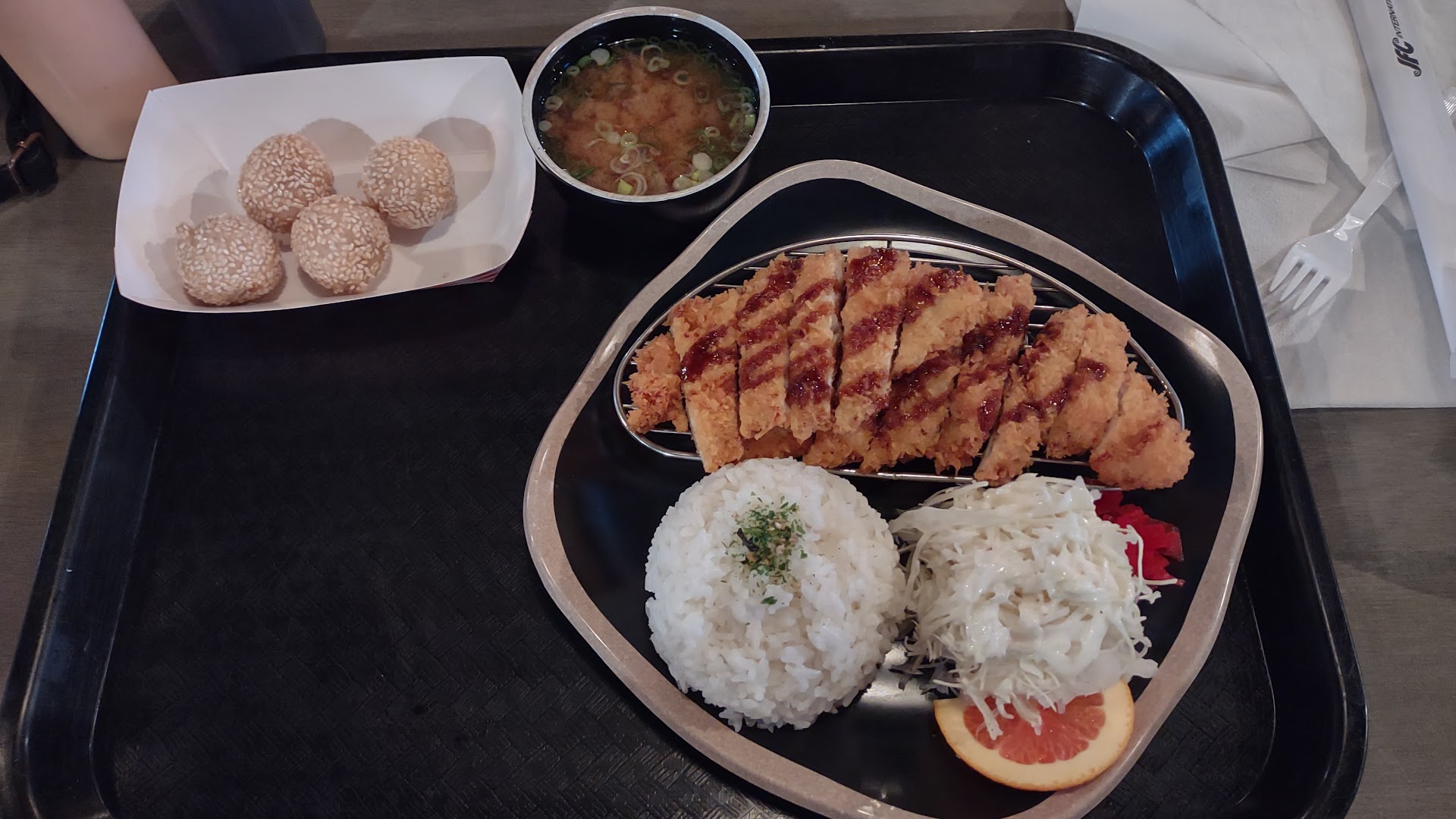 Update October 18, 2024: we ate inside tonight and it was so very good. One of us had the chicken Katsu with curry on it and the other had the classic chicken Katsu. So crispy and good. Had to get the sesame balls again, of course. Big favorite. Thanks, Bulldog Katsu!!