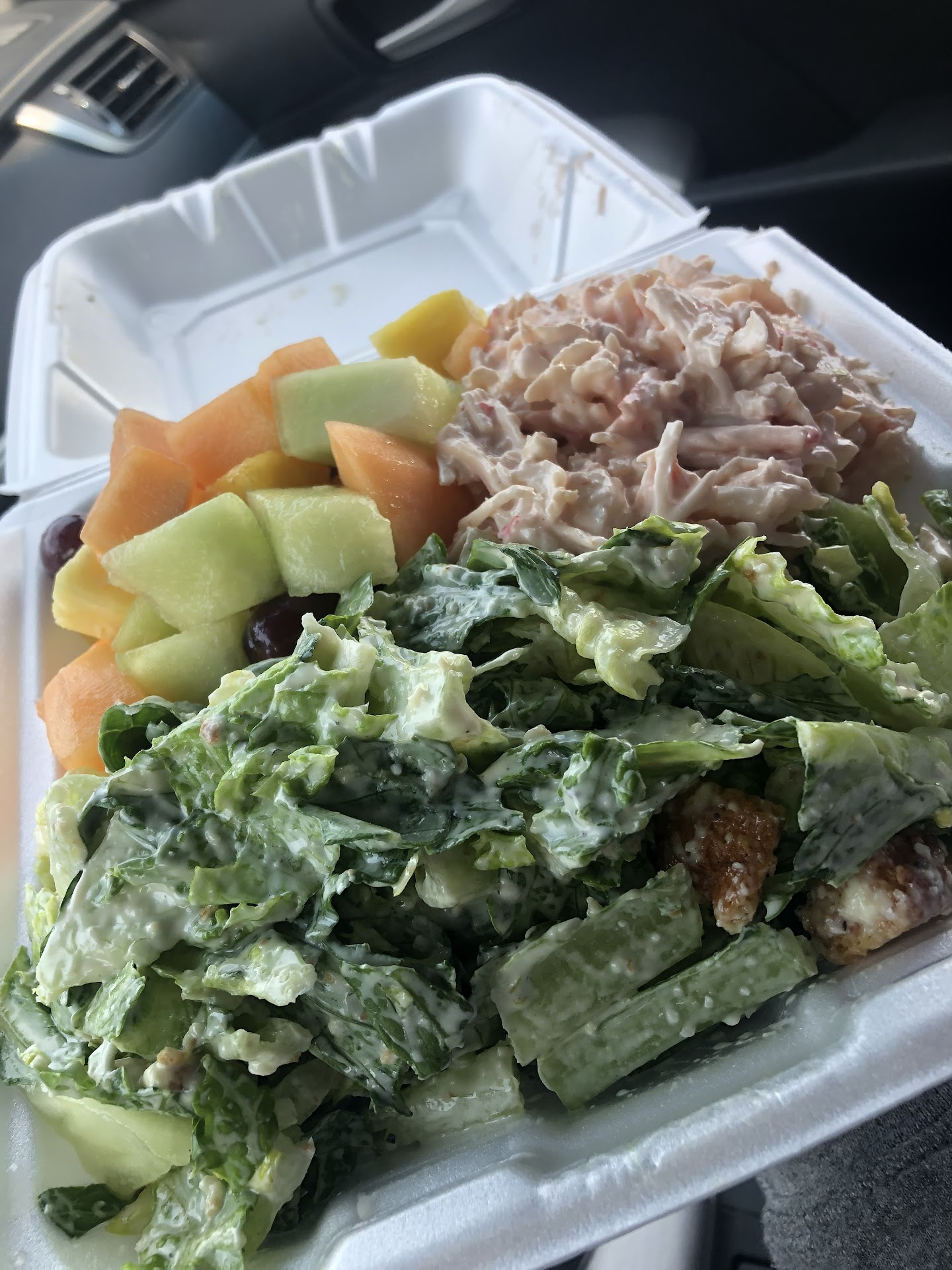 I used to frequent Café Max during my Richardson Jr High PTA days, and occasionally since, in the 20 years since I left Richardson for central Dallas. This time I was picking up on the early side (always used to eat in), to take food to Richardson Methodist for dear friends who are basically family so we could share lunch together while one of our party was admitted there. We all love the Caesar salad and the seafood salad, so that's what I got, along with spinach quiche, in case our ill family member would be up for eating and prefer something more easily digestible. It was early when I picked up, around 10:30, and maybe that was part of the problem. When I walked in, the dining room was almost empty. Nobody acknowledged me for a few minutes while I stood around. Finally someone told me, rather shortly I thought, that I needed to go two doors down for pickup. So I exited the building and re-entered the pickup location. The kitchen was shared and I could see thru to the cafeteria I had just left. It was a little odd considering I was the only customer in either space, but okay. My order was ready and I paid and left. At the hospital, there was a lot going on and we didn't eat for a bit. I finally ended up taking mine because I had to get home to go back to work (WFH). So the order sat about 30 minutes. I was starving so I ate a few bites at traffic lights on the way home. There was a huge amount of food, as is standard at this restaurant. I was surprised to see the Caesar literally drowning in dressing. No parmesan cheese evident anywhere, which I swear I remember but maybe that's just when I make it at home, and maybe two croutons. Looked like they maybe didn't mix it up properly? I recall big bowls of many servings, so that's certainly possible. And my doc would probably disagree, but in my opinion it's better to have too much dressing than not enough - so that was okay. I had parmesan at home, and my doc and I can agree I don't need croutons :).