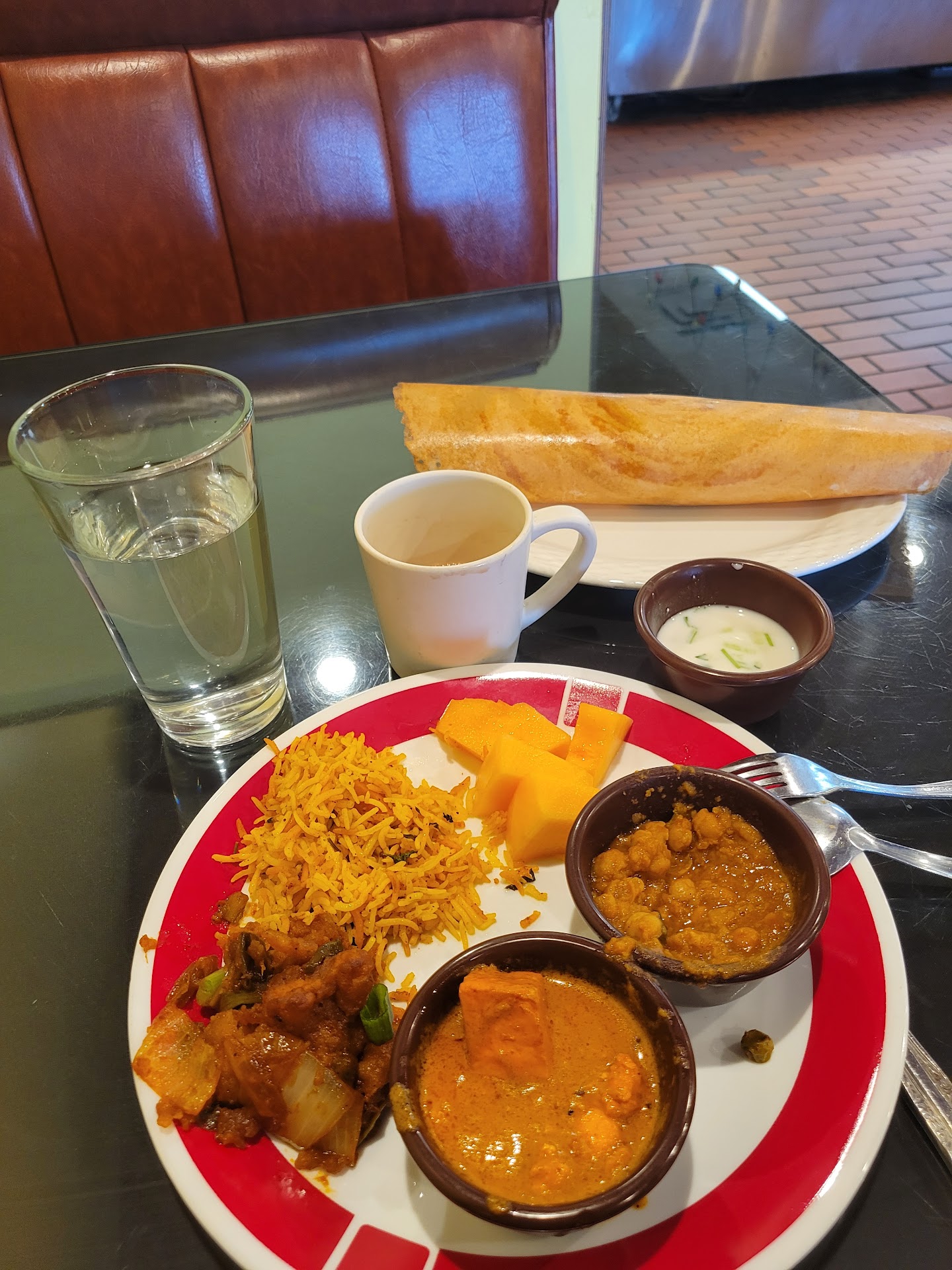 North Indian Thali - 3.8 stars overall Thali items rating - Raita 3 stars (a bit too creamy texture for raita for us)., Mutter paneer - 5 stars, Dal Makkhani - 5 stars, Aalo curry - 3.5 stars, Navratan korma - 3.5 stars, biriyani - 4 stars, rice 5 stars, chapati - 3.5 stars, kheer - 3.5 stars, Halwa - 5 stars - Salad 2 stars(onions and leamon slice - worst ever! seemed like they had this cut before hand and straight away brought from the refrigerator - Lets just say I did not eat it and kept it far away from my plate), Wada - 4 stars