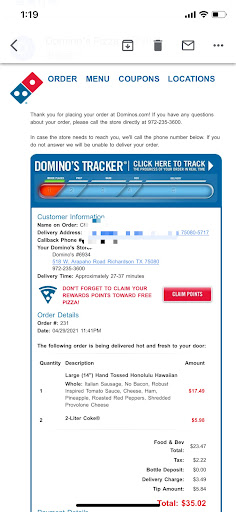 Ā Ā Ā Read moreCON ARTISTS AND ULTRARUDE: Don't see the original review we wrote, so just in case, here we go again. Received a coupon - 'FREE medium pizza with two toppings...order now!' So we tried to. Pulled up the site, went through ordering and checkout (expected the five dollar delivery fee since we've ordered from Dominos before and hey! The pizza IS free, right?). Well, no. Can't check out because twenty dollars in additional food needs to be added to order. Nowhere in the coupon is that stated. Nowhere. Just a bold scummy con artist move. Called and tried to talk to both Kayla and Adriana, each unprofessional, insulting and needlessly horrible in her own way and each claiming to be the location's GM. In sort: 'You don't like how we run our business? Go order somewhere else. We have more than enough customers. Don't care about your so-called complaint'. CLICK. Twice.