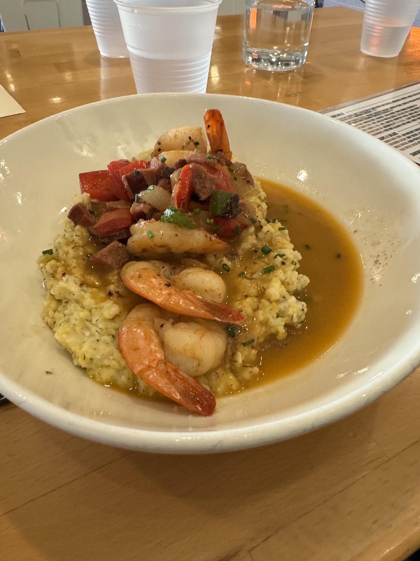 It took a while for my shrimp and grits to arrive (with no cutlery) and my husband still had no new drink. I received cutlery and ate my lukewarm grits with hot shrimp and sausage (as if the grits waited for quite some time to be topped). When I was almost finished, the waitress stopped at our table and said she would go check on the drink: After I finished my grits, I walked inside to tell her we just wanted our check and no drink. She took the drink back to the bar and returned with our check WITH the second drink listed. My husband handed her a card without noticing. Then I walked back in to tell her it needed to be removed.