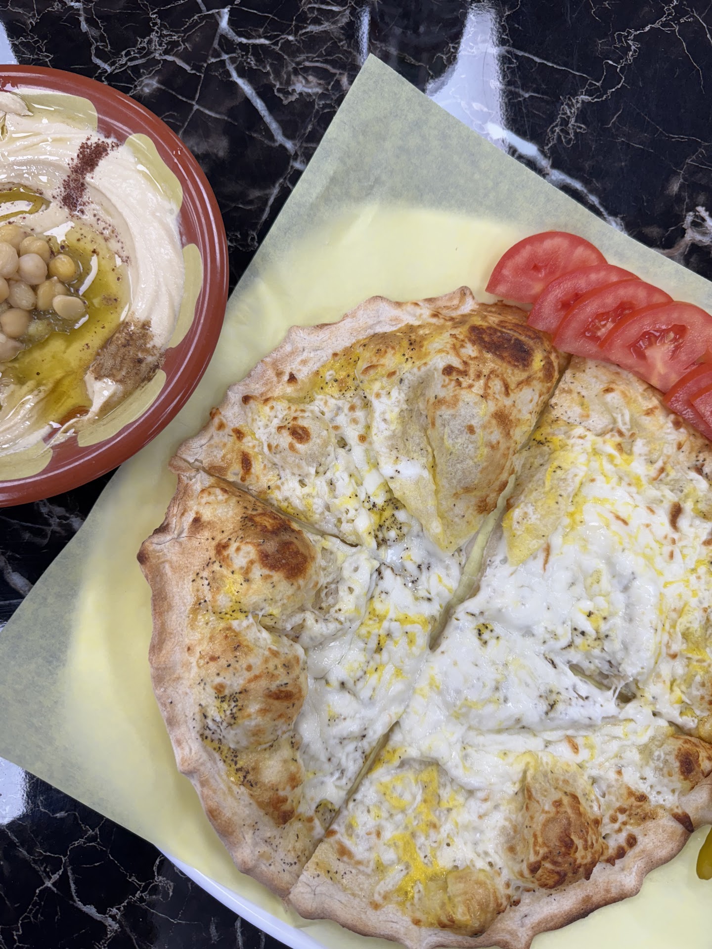 Mom and I ordered Hot Cardamom Tea (there is a self-serve station toward the back of the restaurant), and shared the Chicken Shawarma Plate (with Rice) and the Za’atar/Cheese Pie. We also made a Hummus (to-go order) which included one hot, freshly-baked in-house Pita Bread and enjoyed it at home with dinner. When I tell you that Hummus was the best we have had since leaving the Middle East all those years ago, I truly mean it. The portions are ideal. The authentic Arabic flavors I knew then and grew up loving teleported me back for a moment in time and were reminiscent of my Middle-Eastern Childhood. IYKYK.