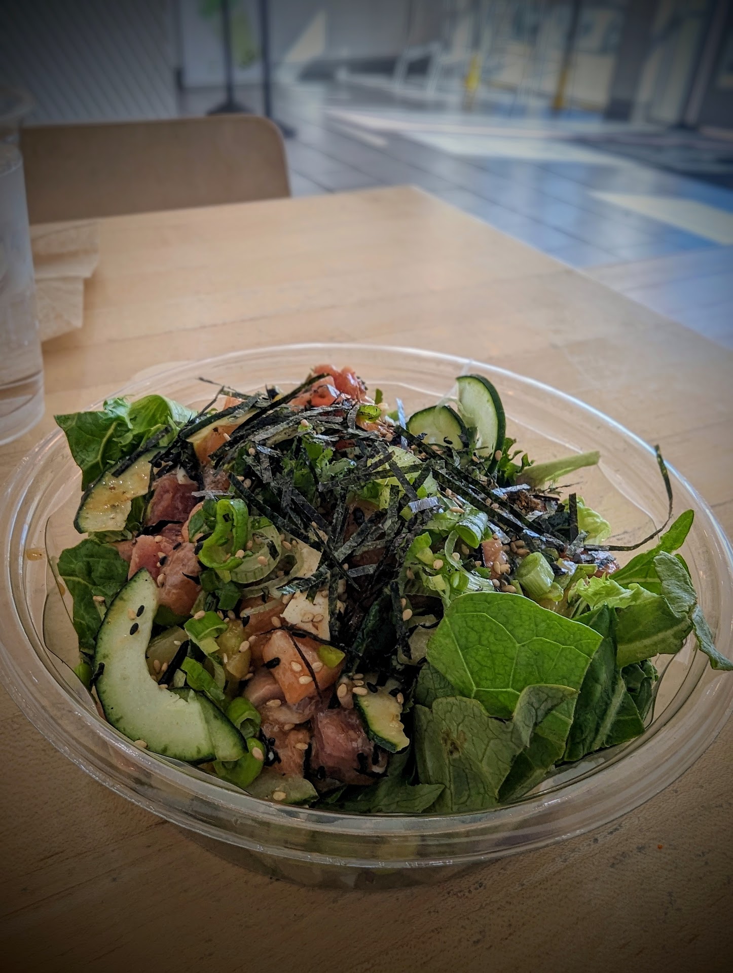 Read moreCame in for lunch with my wife and we both ordered poke bowls and a drink. They put it all on one tray and when we put the tray on the table, one of the bowls accidently tipped over dumping 3/4 of the bowl onto the tray and some onto the table. I looked up and she quickly looked away and tried not to notice as I said something to her about it. As my wife is now trying to clean the table in embarrassment, the worker made no attempt to come help clean. I'm sure she was just trying to avoid the whole "meal replacement" which is fine. But she could've offered more salad at least, but she did offer a soup which ended up having a hair in it. So now my wife is eating poke off a tray and I'm eating my bowl without a tray on a semi sticky table. We were the only customers in there so it wasn't like they were too busy to assist.
