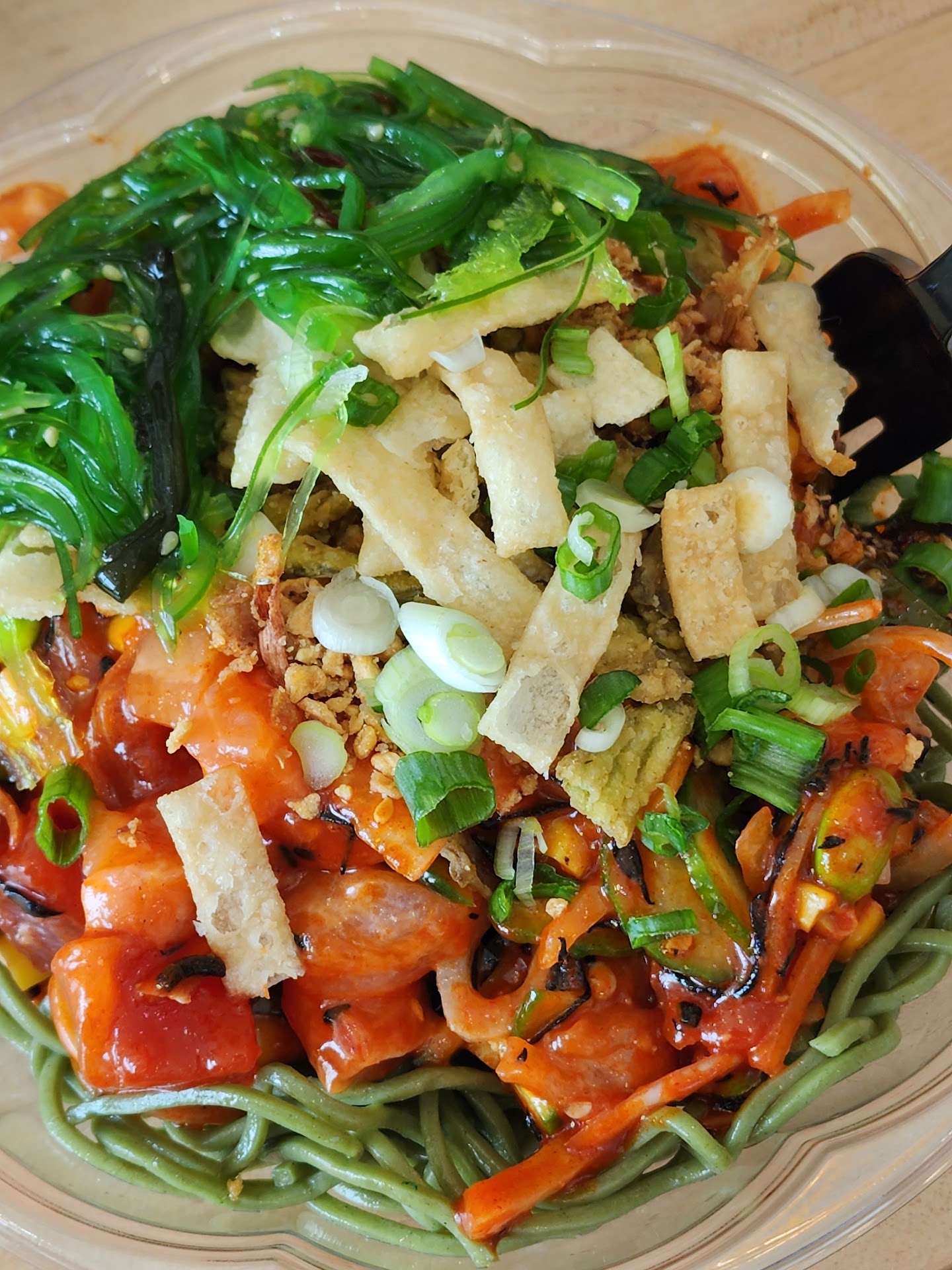 For myself during lunch, I order a large bowl, which allows me three choices of protein. For my base, I selected salad. For the protein, I selected spicy tuna, spicy salmon, and regular salmon. Included were various choices of toppings such as edamame, cucumber, pineapple, nori, etc...